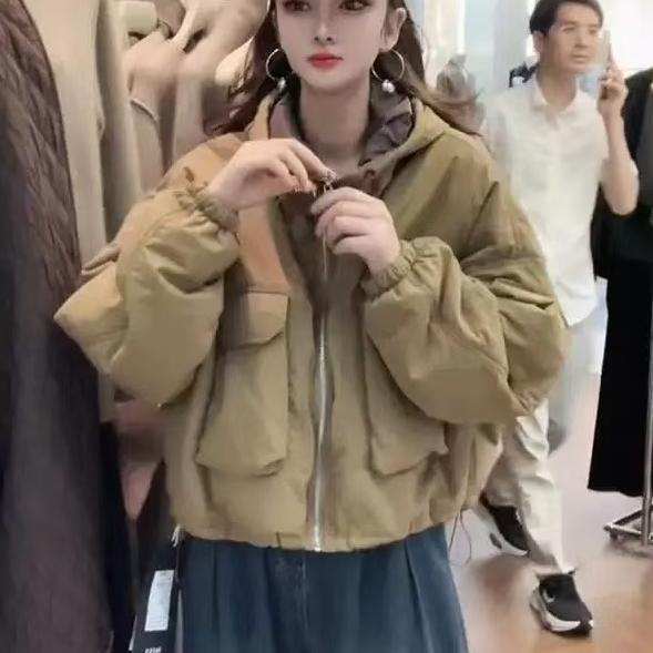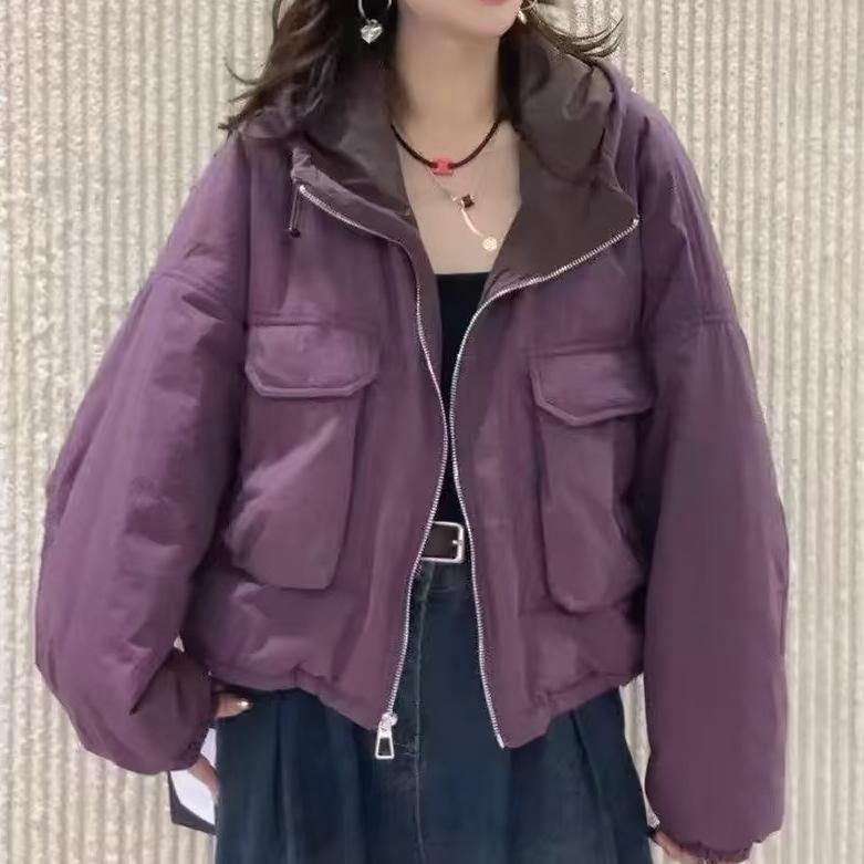 短款撞色连帽休闲棉服女设计感时尚宽松百搭双口袋棉衣T11#