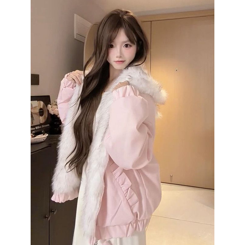 甜美多巴胺双面穿座山雕外套加厚保暖棉服女学生冬季可爱连帽棉衣