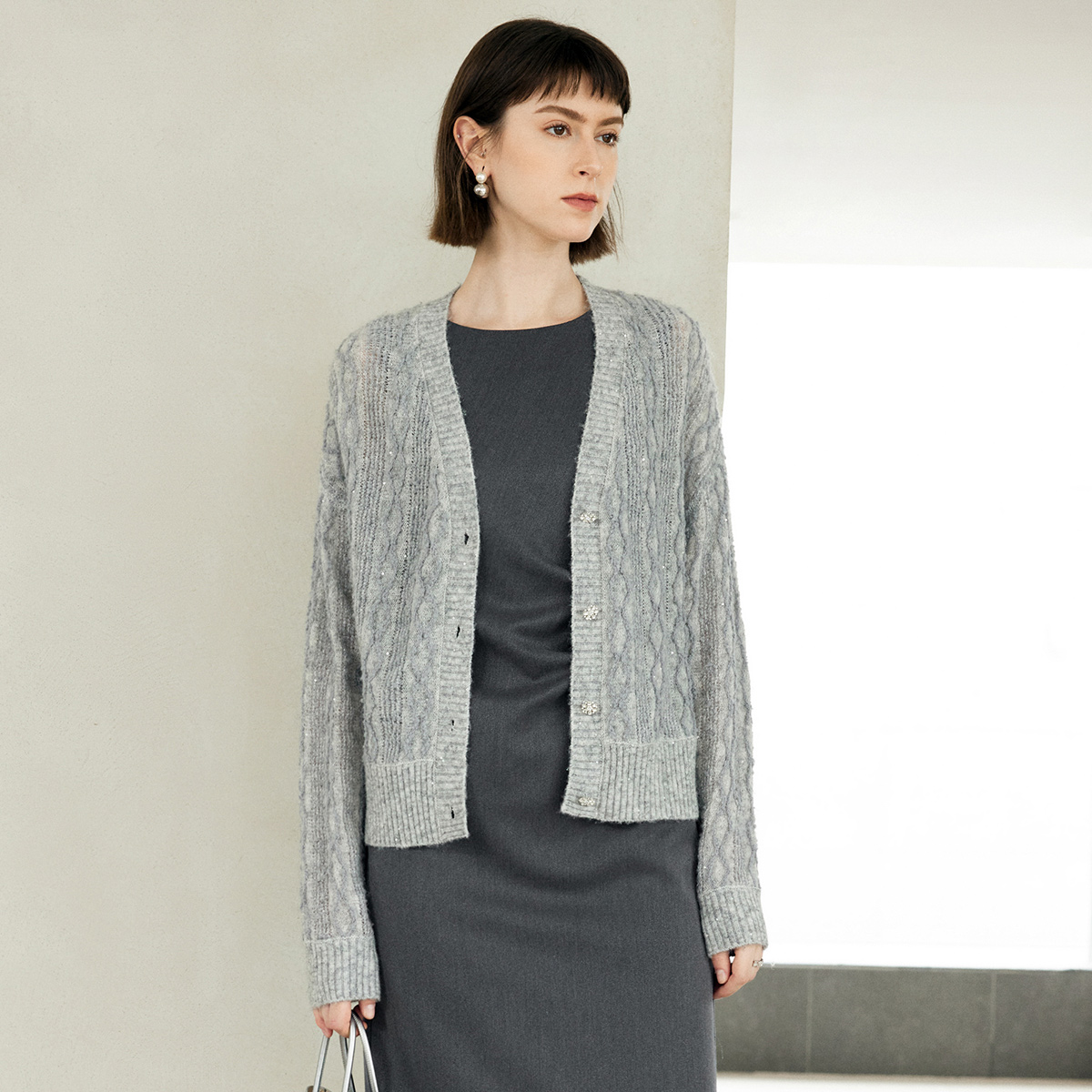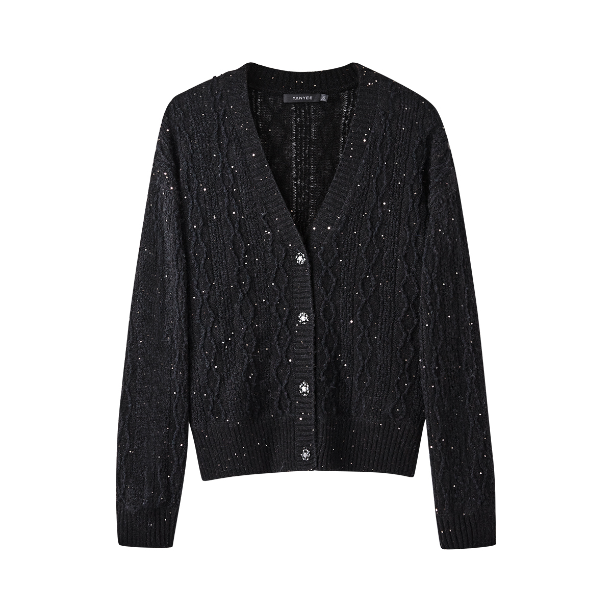 颜域绵羊毛黑色针织衫女士2025新款秋季时尚外套细闪开衫V领上衣