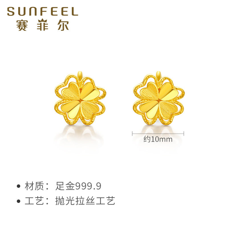 赛菲尔黄金耳饰足金999.9四叶草耳钉黄金简约百搭花朵耳圈送女友
