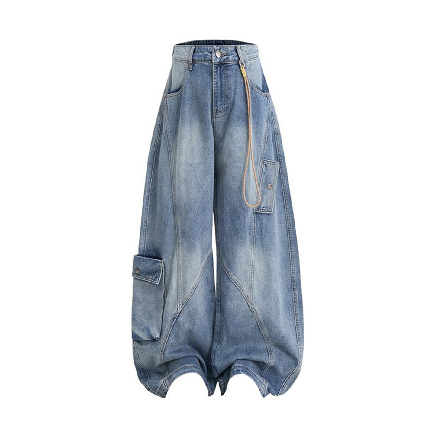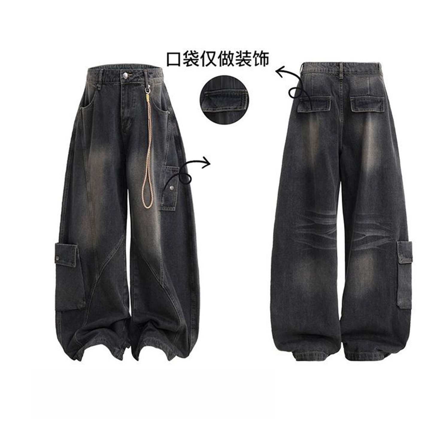 300斤特大码美式高街牛仔裤女胖mm设计感黑色多口袋工装阔腿裤子