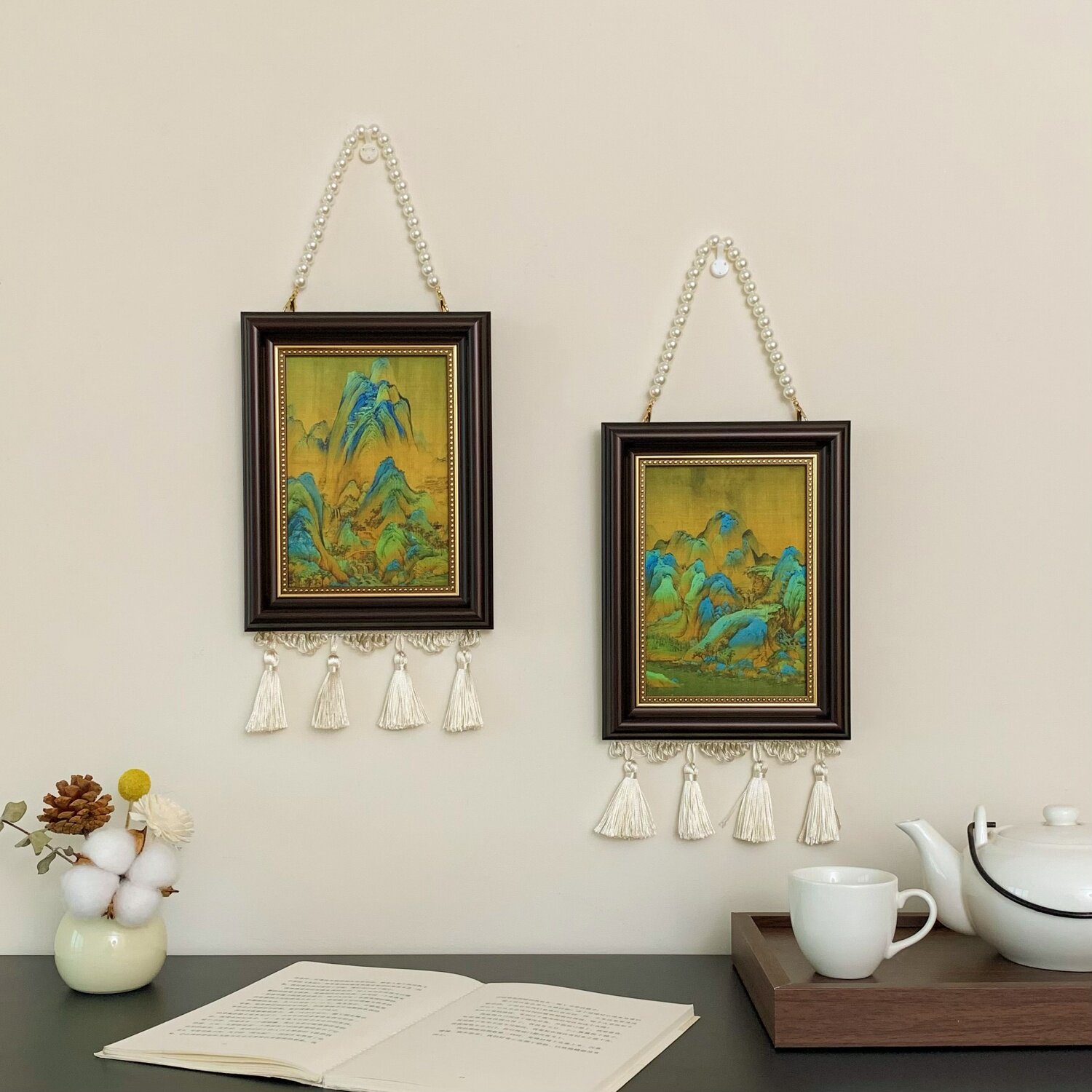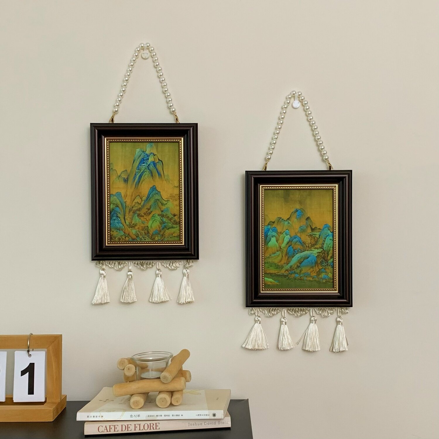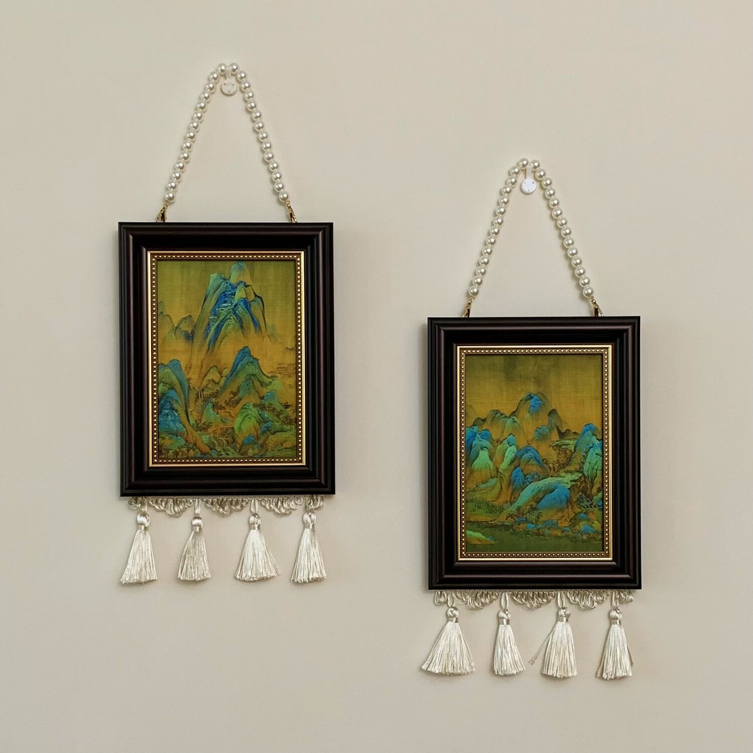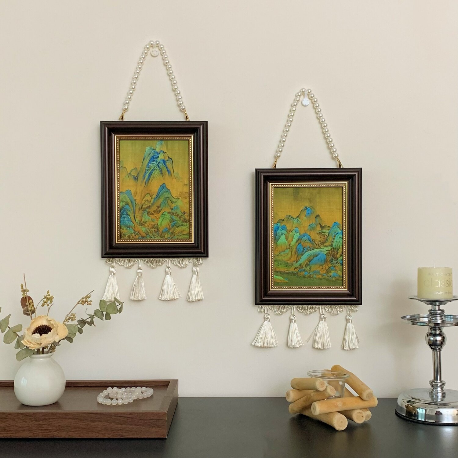 法式复古珠链挂画千里江山图相框背景墙装饰画餐厅卧室床头画软装