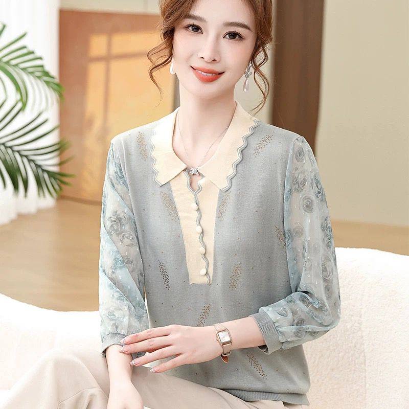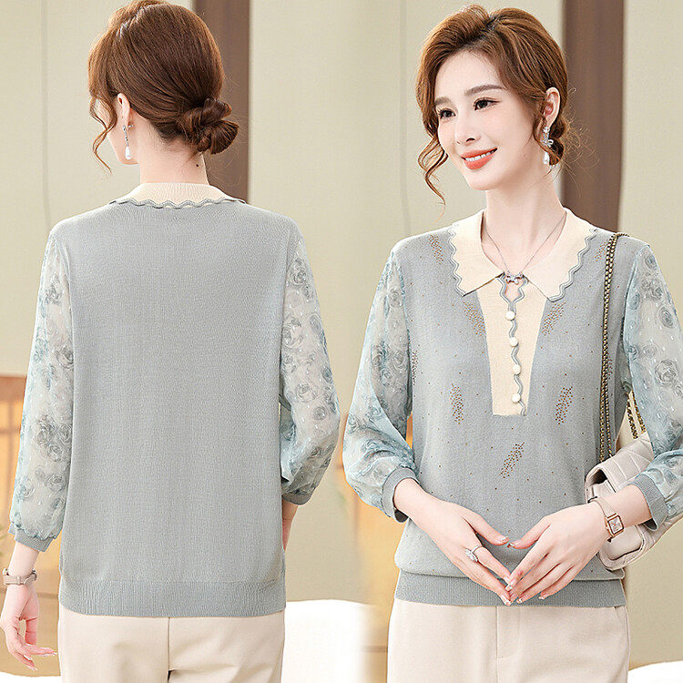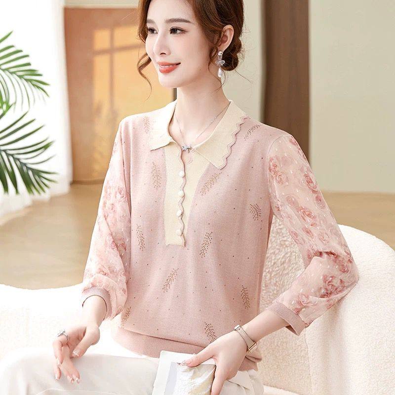 2025新款妈妈春夏七分袖纱袖T恤洋气翻领上衣中老年女春装针织衫