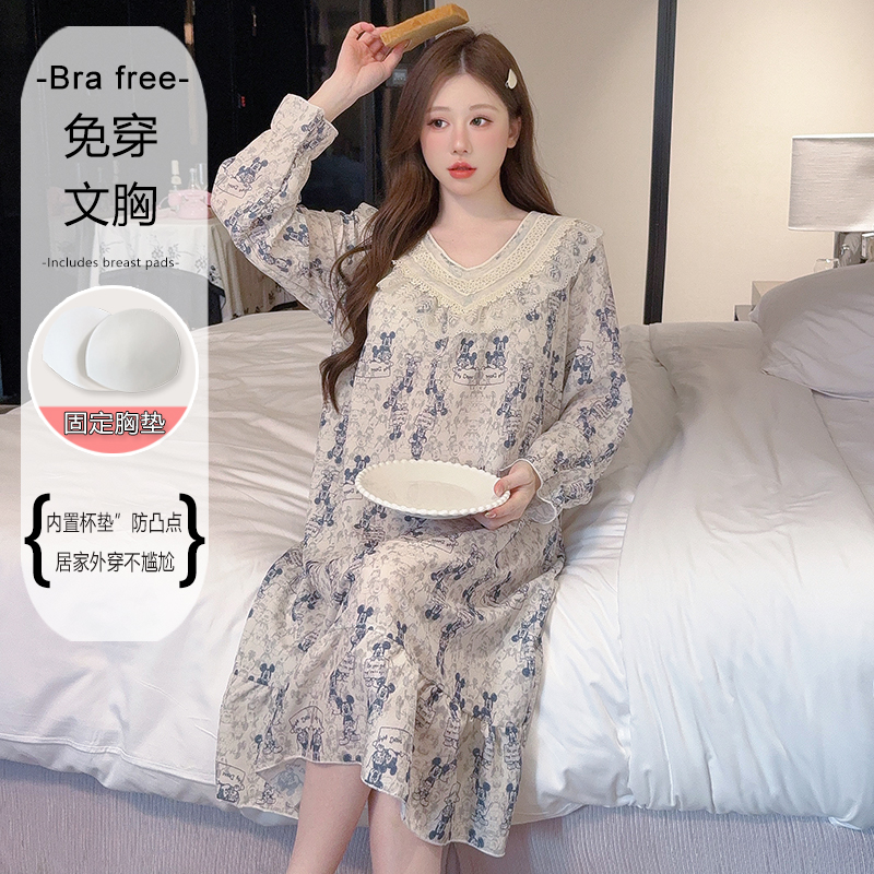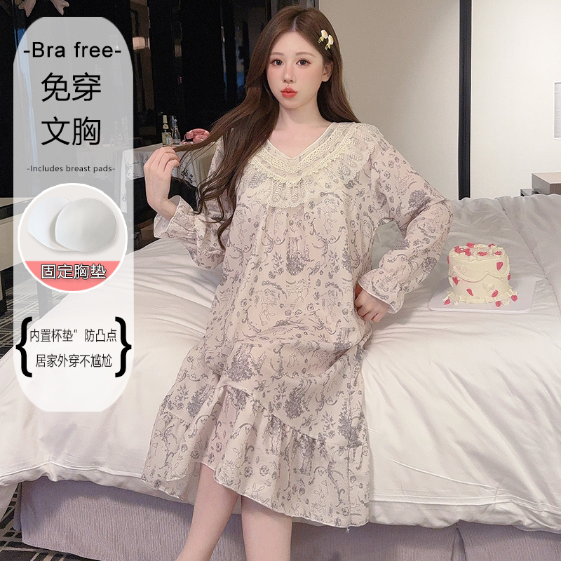 2025新款秋冬季睡衣女带胸垫睡裙花边长袖大码公主风可外穿连衣裙