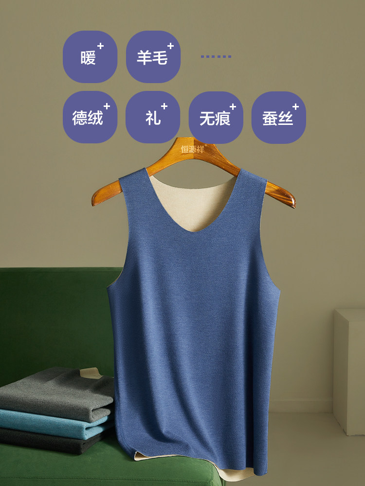 恒源祥蚕丝德绒无痕保暖背心男秋衣冬季含羊毛打底衫发热马甲上衣
