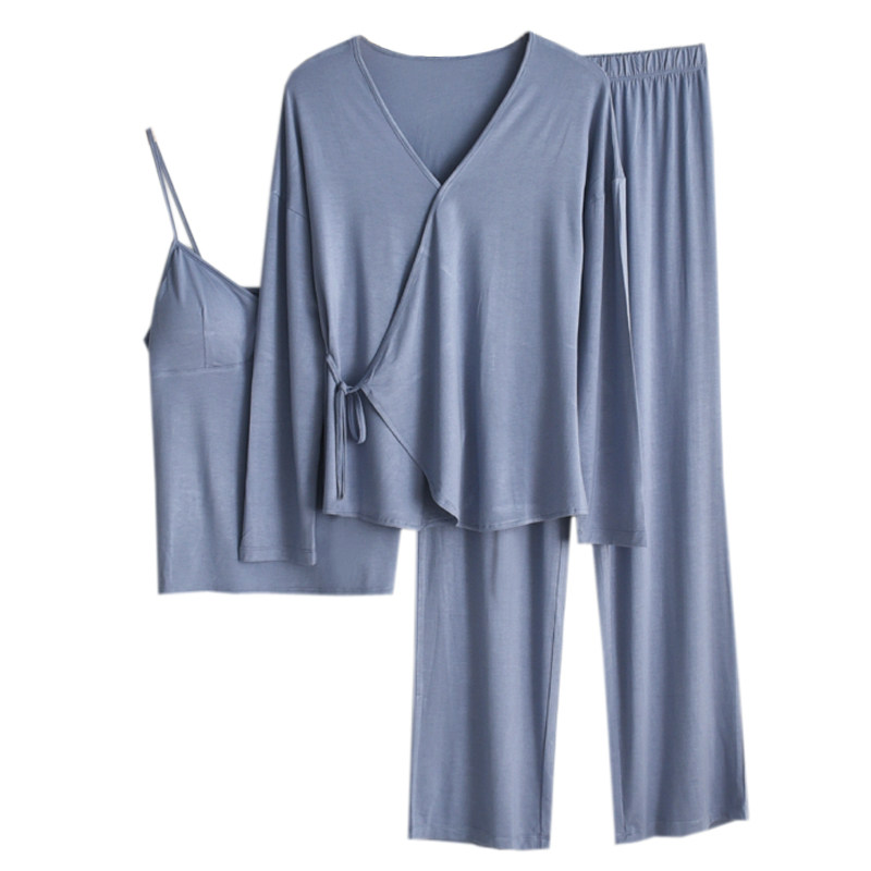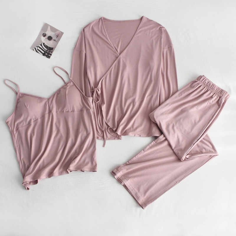 日式睡衣女春夏季莫代尔薄款长袖外套胸垫吊带长裤家居服三件套装