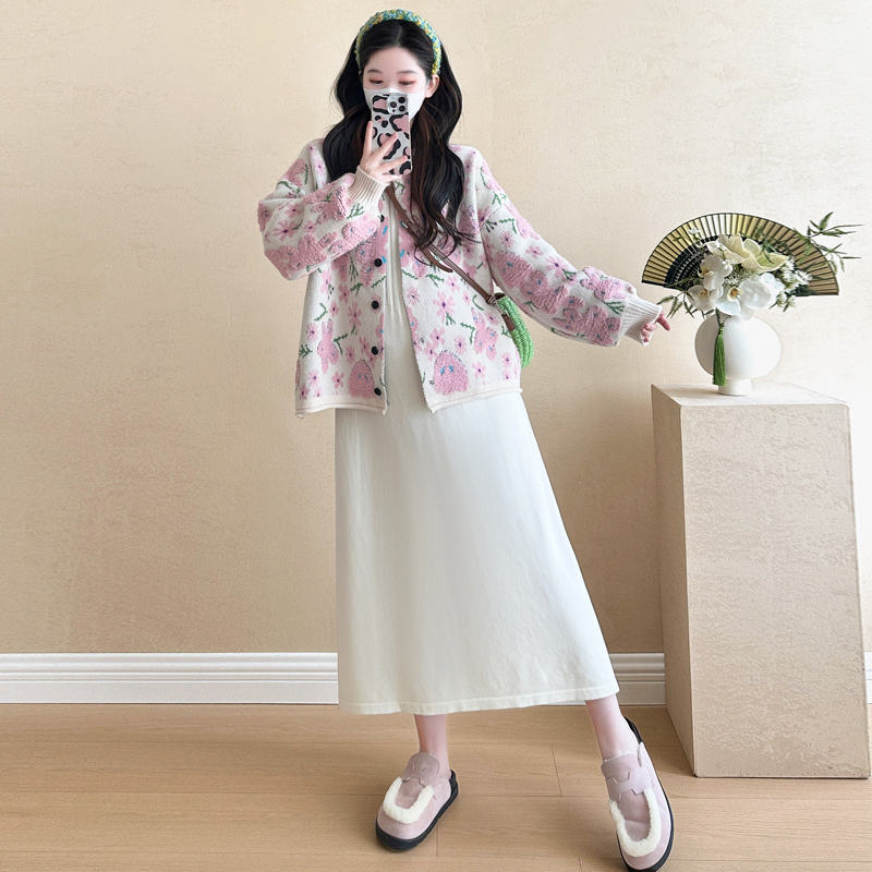 孕妇装春装2025新款套装花朵高级感粉色毛衣外套针织连衣裙秋冬季