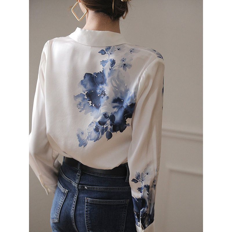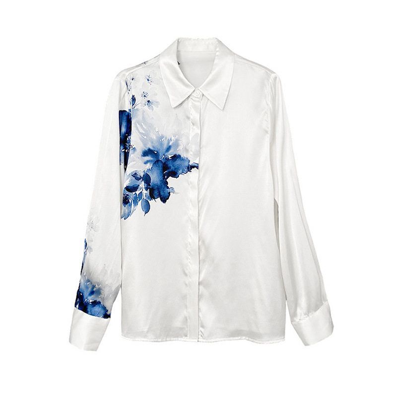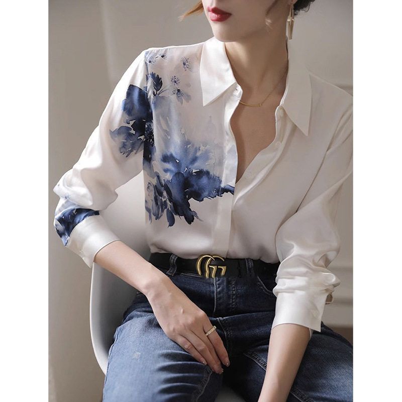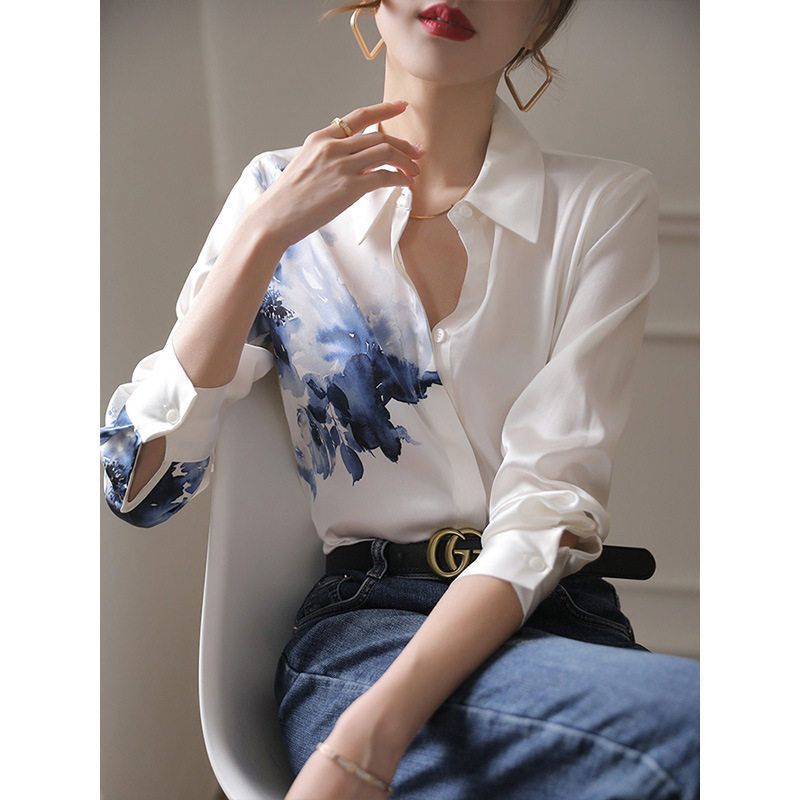 高级感缎面白衬衫新中式国风水墨印花衬衣2025年夏季女装长袖上衣