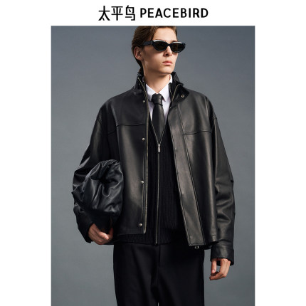 【真皮皮衣】太平鸟男装立领机车皮夹克秋拼接外套黑色质感外套