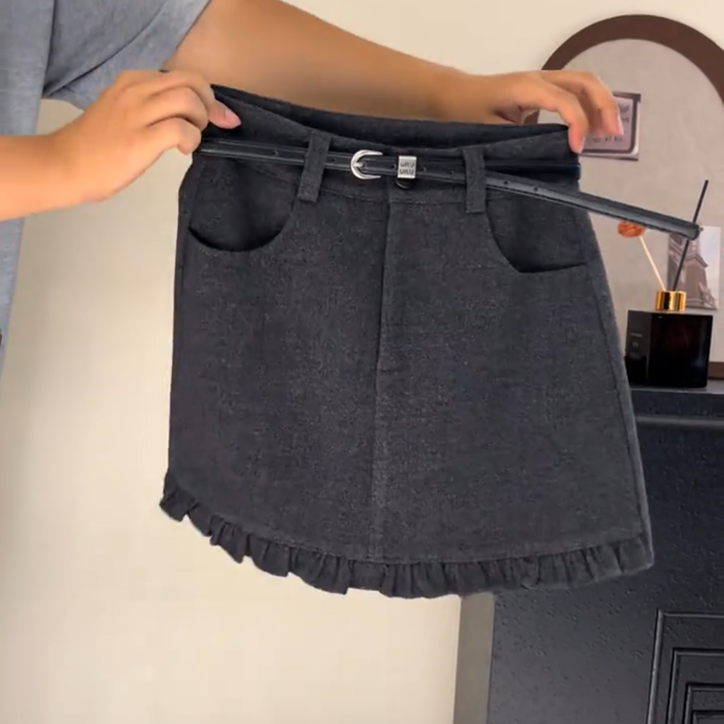 深灰色毛呢半身裙女秋冬新款高腰显瘦a字裙大码百搭花边包臀短裙