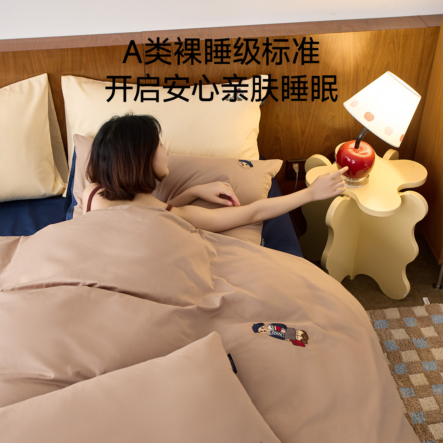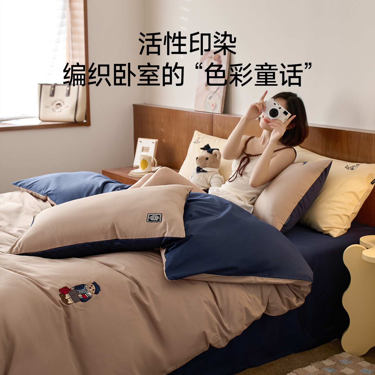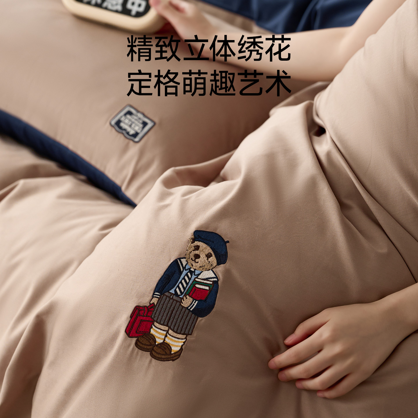 TeenieWeenie小熊奶咖蓝纯色双拼四件套全棉水洗棉被套罩男生可用