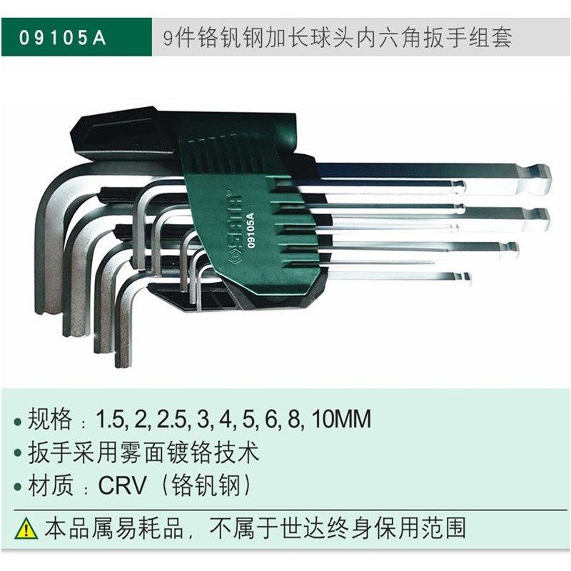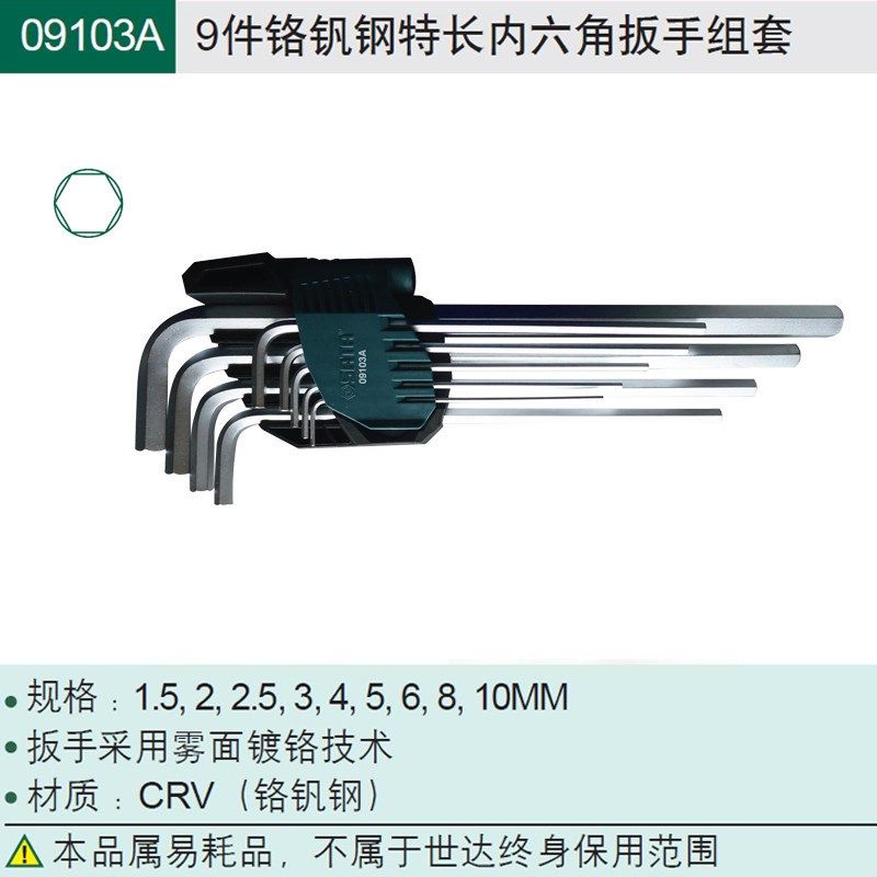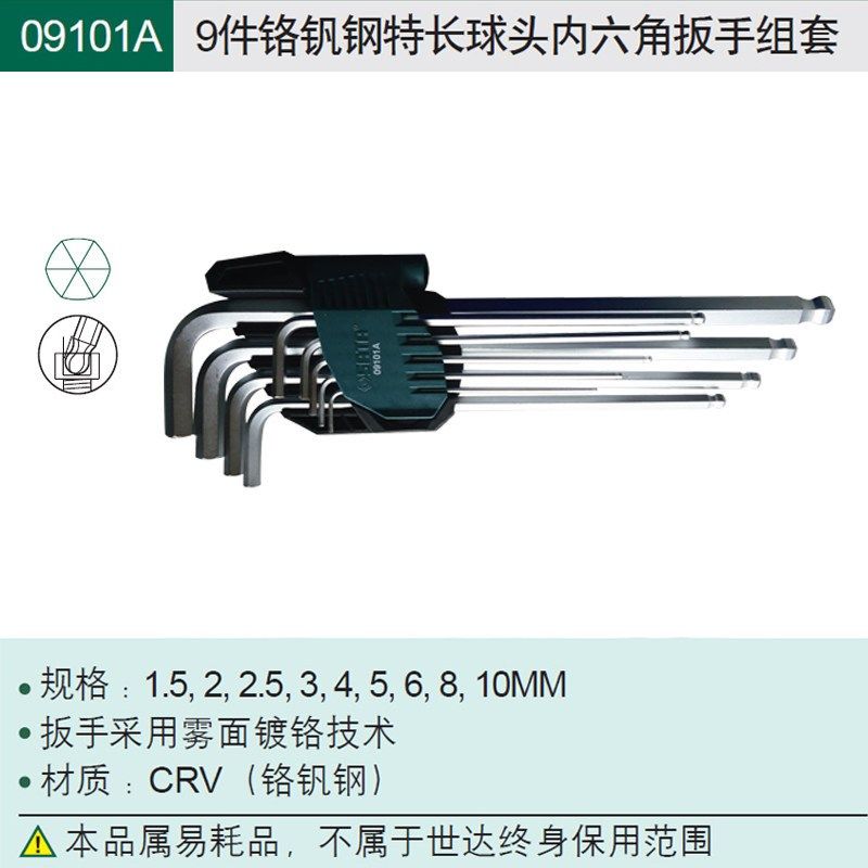 世达工具9件套装加长特长铬钒钢内六角扳手09101A- 09107A