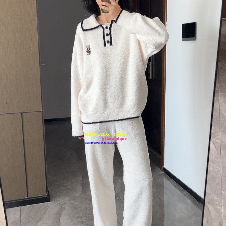 日本GP冬季新款小熊刺绣可外穿家居服加厚保暖半边绒家居服套装