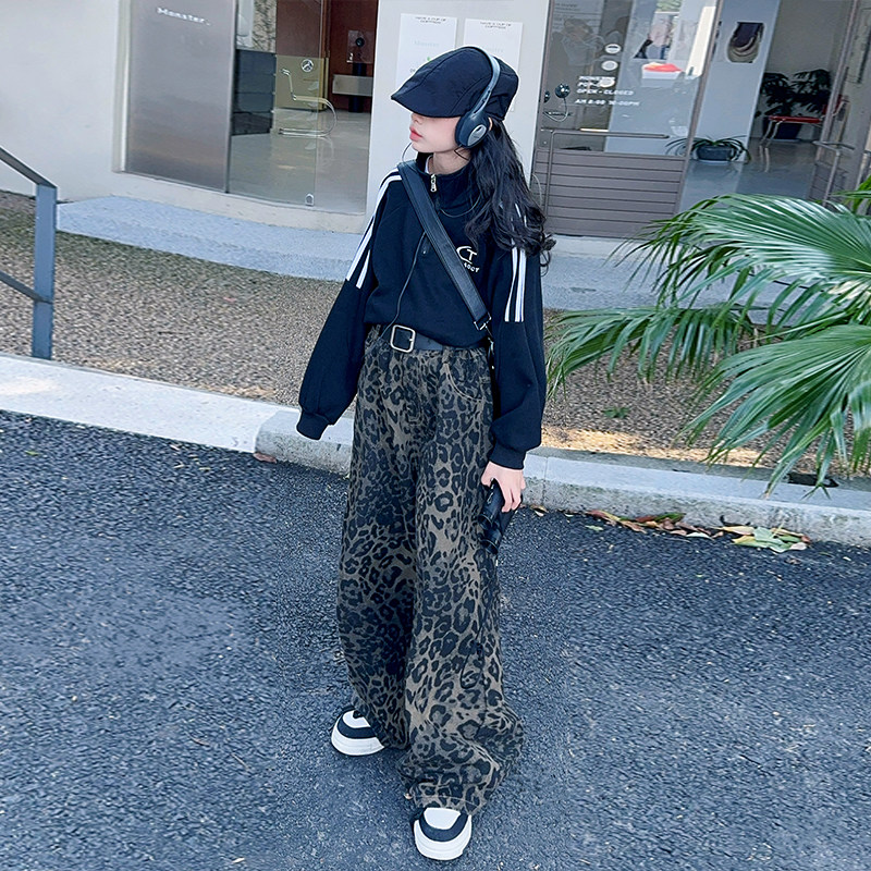 女童秋冬套装洋气韩版美式加绒豹纹牛仔裤子休闲立领短款开衫卫衣
