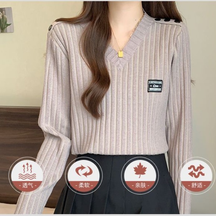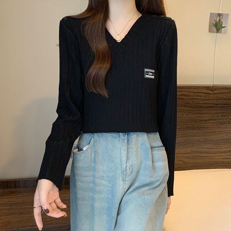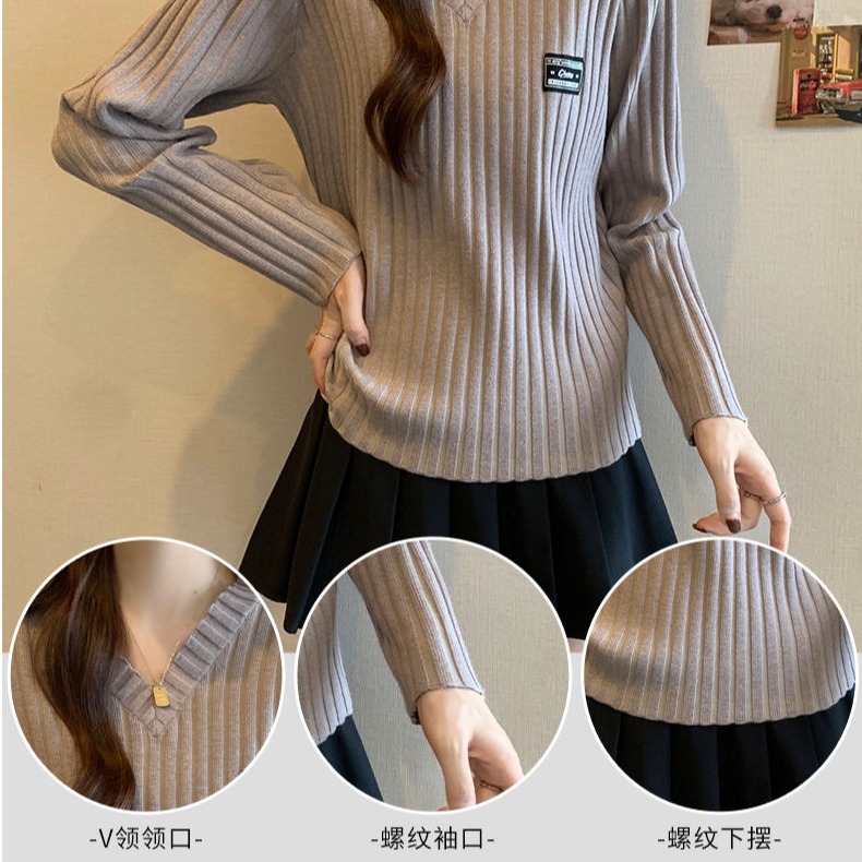 实拍2025秋冬针织衫女韩版宽松显瘦百搭纯色V领长袖打底毛衣上衣