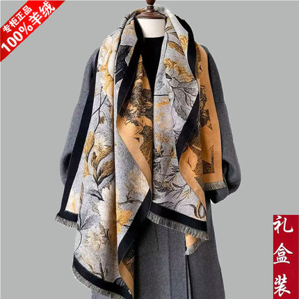 鄂尔多斯市100%纯羊绒围巾女冬季高档提花加厚披肩外搭两用送妈妈