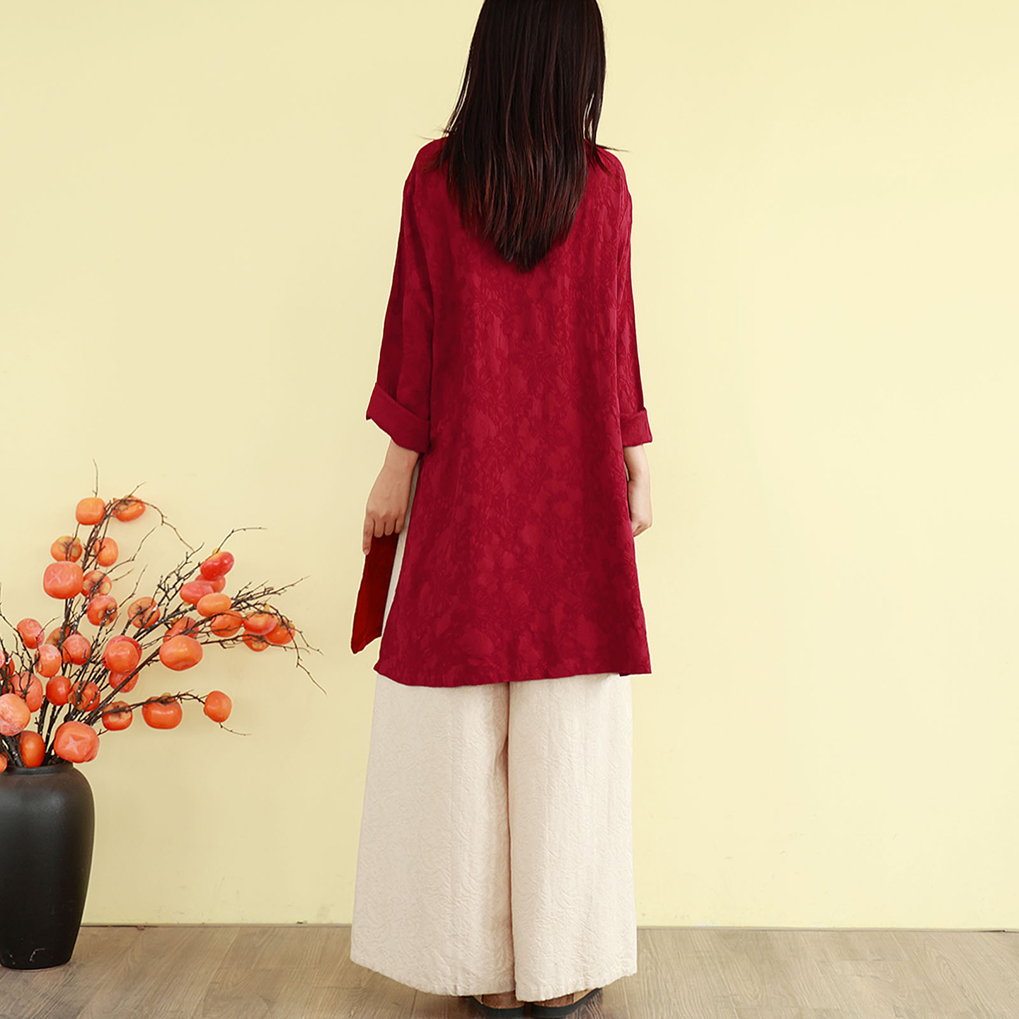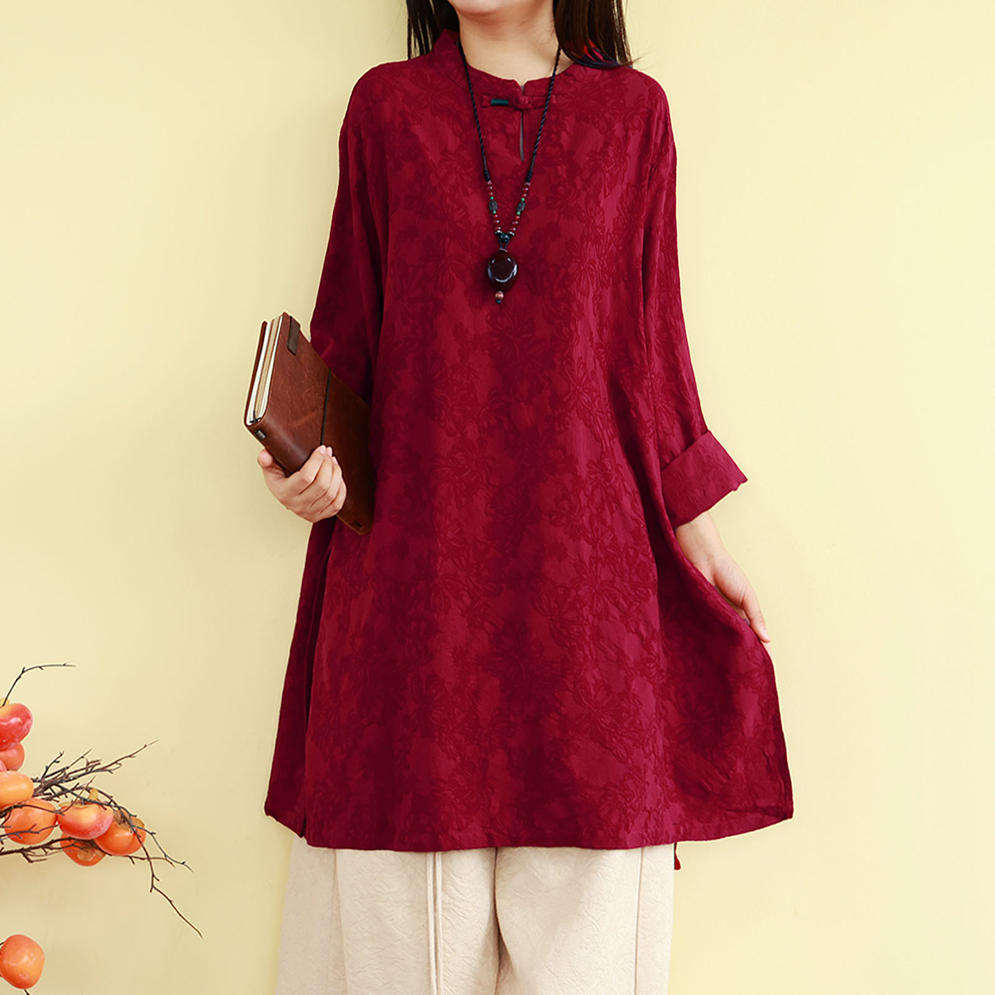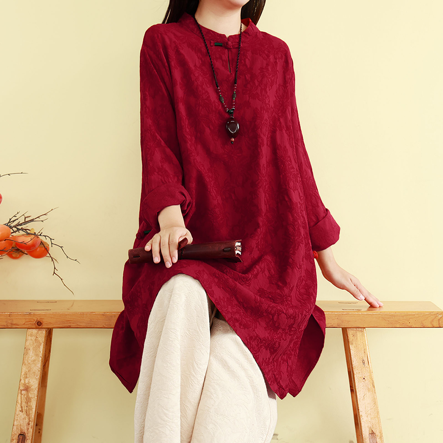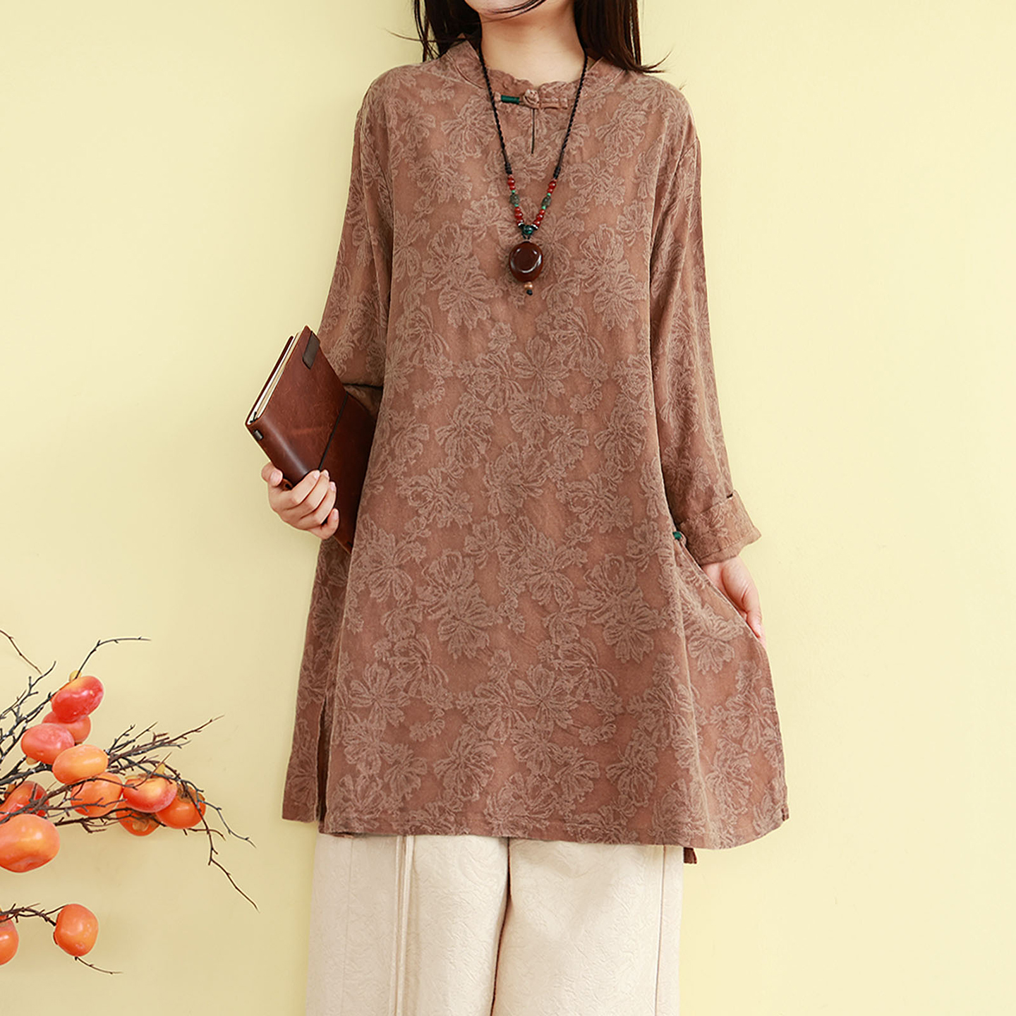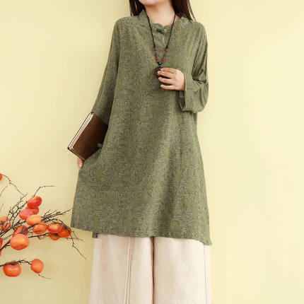 复古新中式亚麻提花衬衫女秋冬季中长款长袖宽松茶服盘扣显瘦上衣