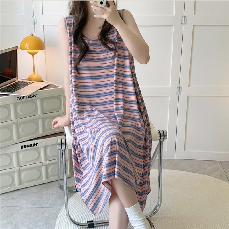 夏天大码显瘦可外穿无袖睡衣胖MM条纹背心睡裙中长款女家居服薄款