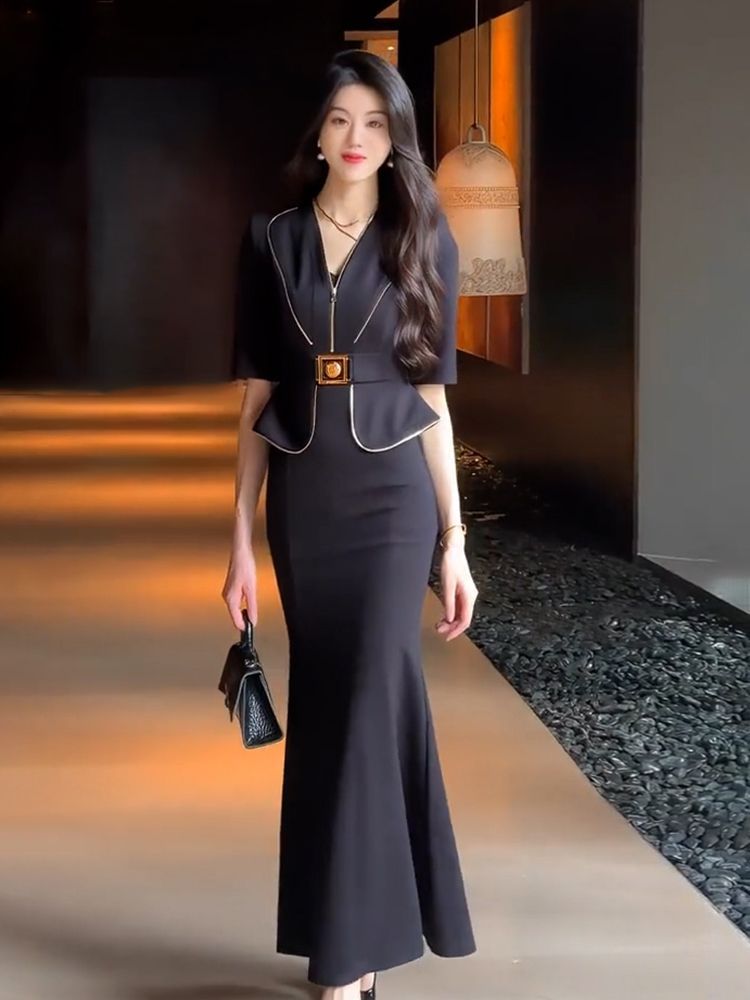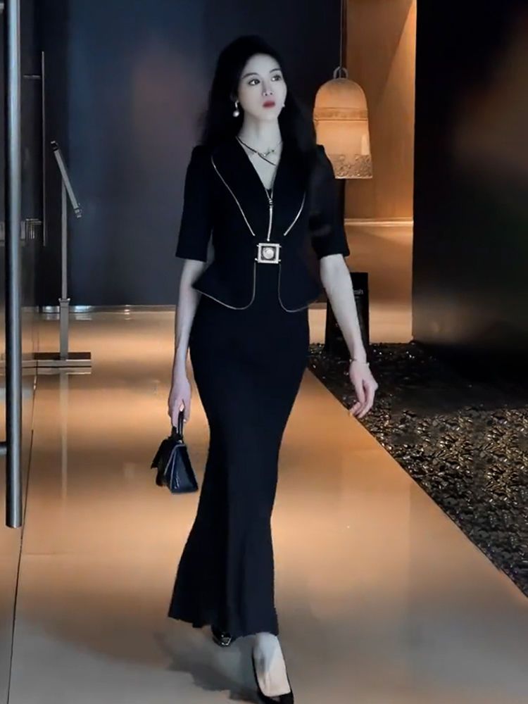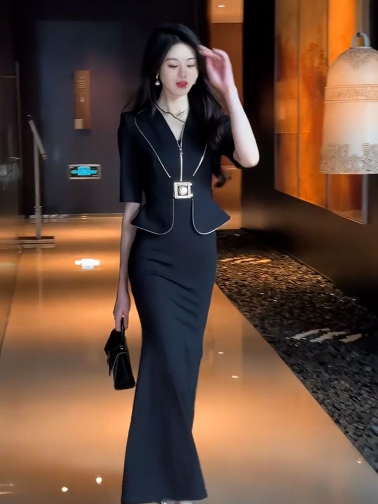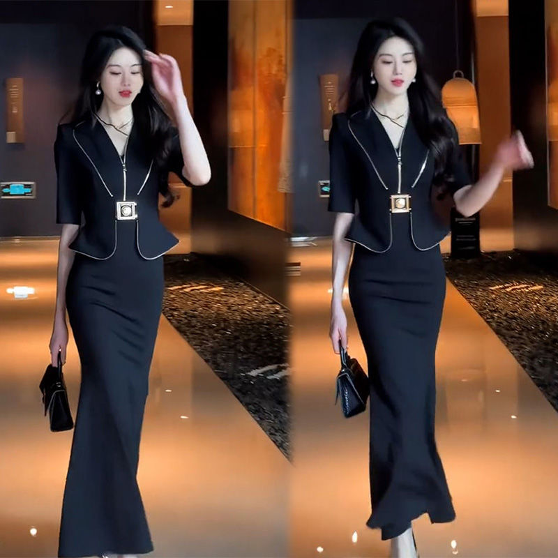 2024新款设计感拼接腰带假两件连衣裙女夏季法式时尚气质包臀裙