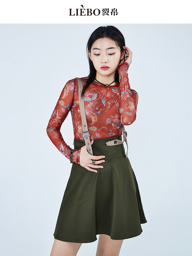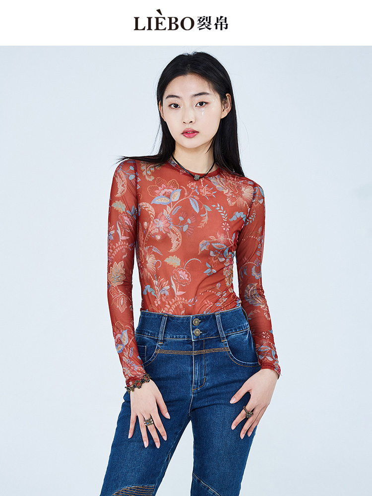 裂帛设计感新中式复古国风植物花卉长袖修身T恤女网纱打底外穿夏