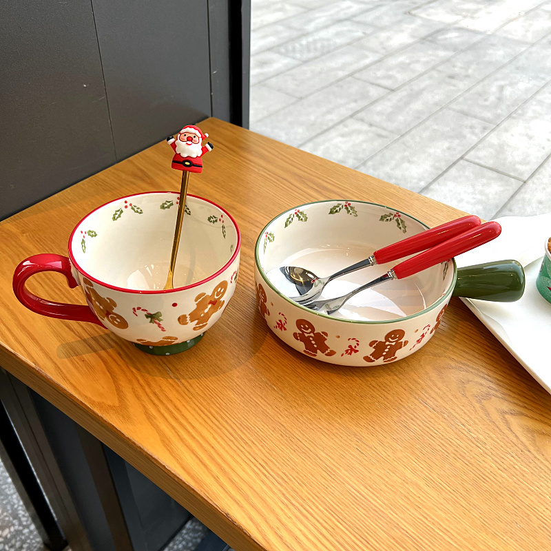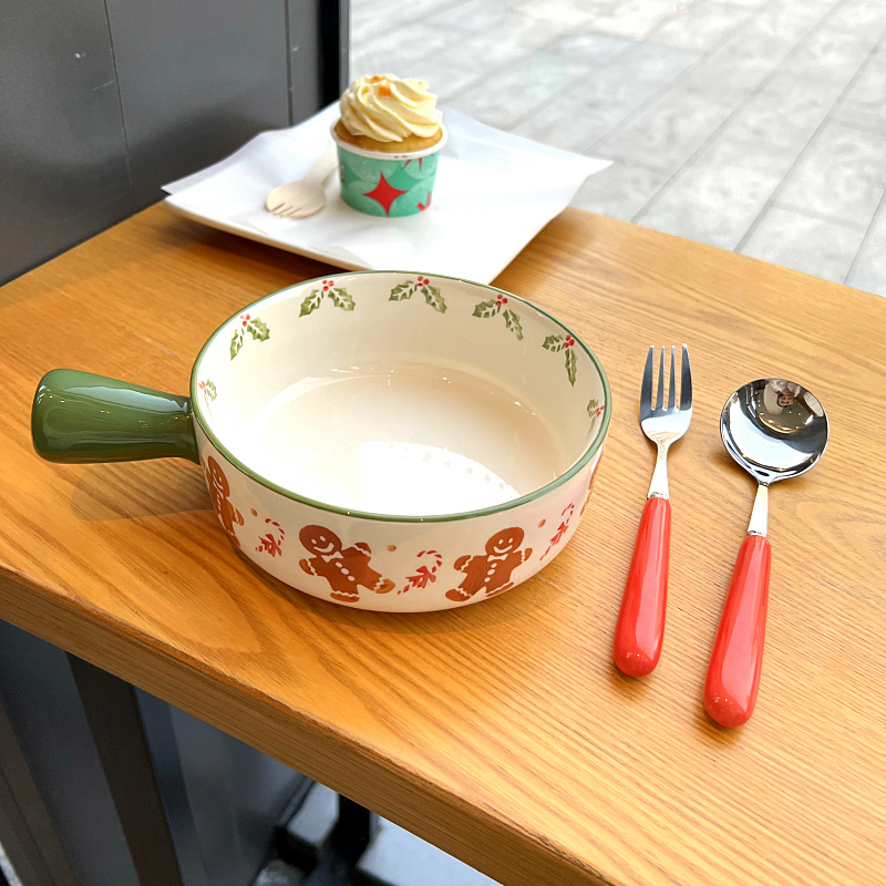 可爱卡通圣诞姜饼人带手柄泡面碗釉下彩陶瓷沙拉碗微波炉专用家用
