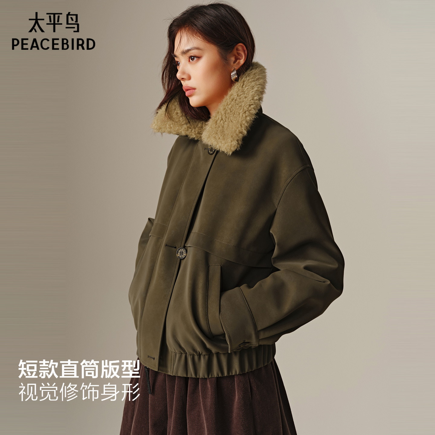 【商场同款】太平鸟双色绒感PU皮外套女短款可脱卸毛领AABBF4377