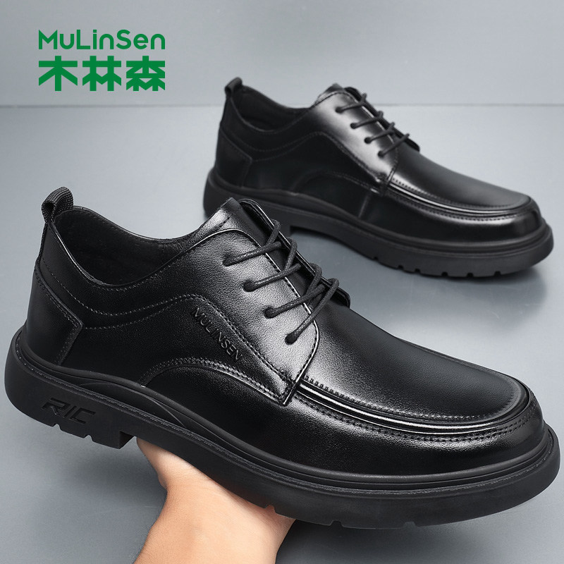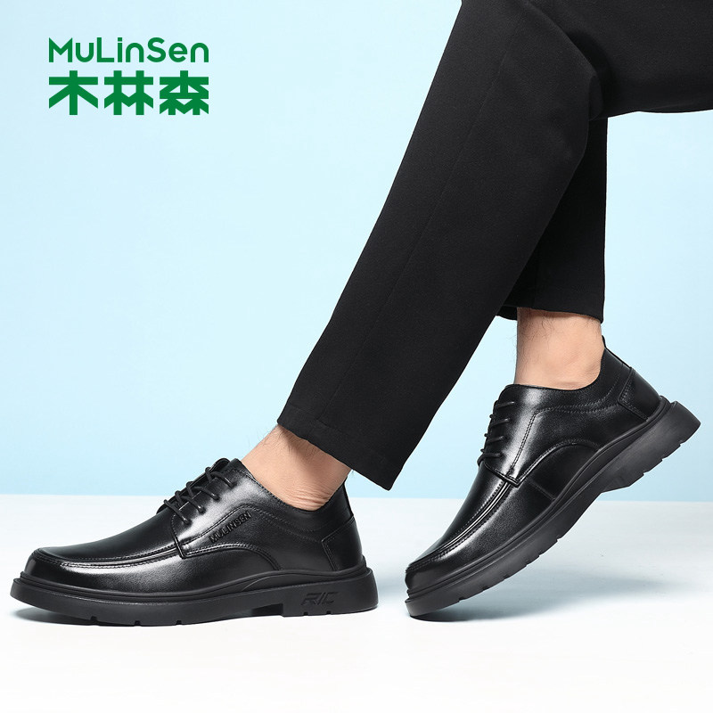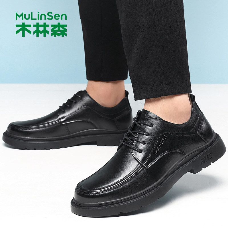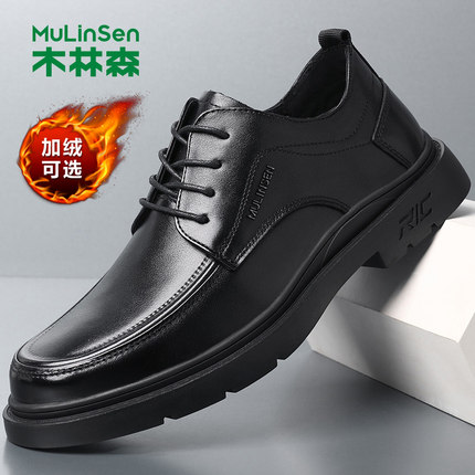 木林森男鞋真皮商务正装休闲皮鞋黑色系带通勤工作鞋加绒保暖软底