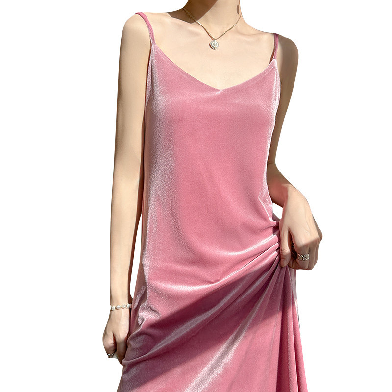 红色金丝绒吊带设计感连衣裙女春夏无袖法式复古内搭裙子过膝长裙