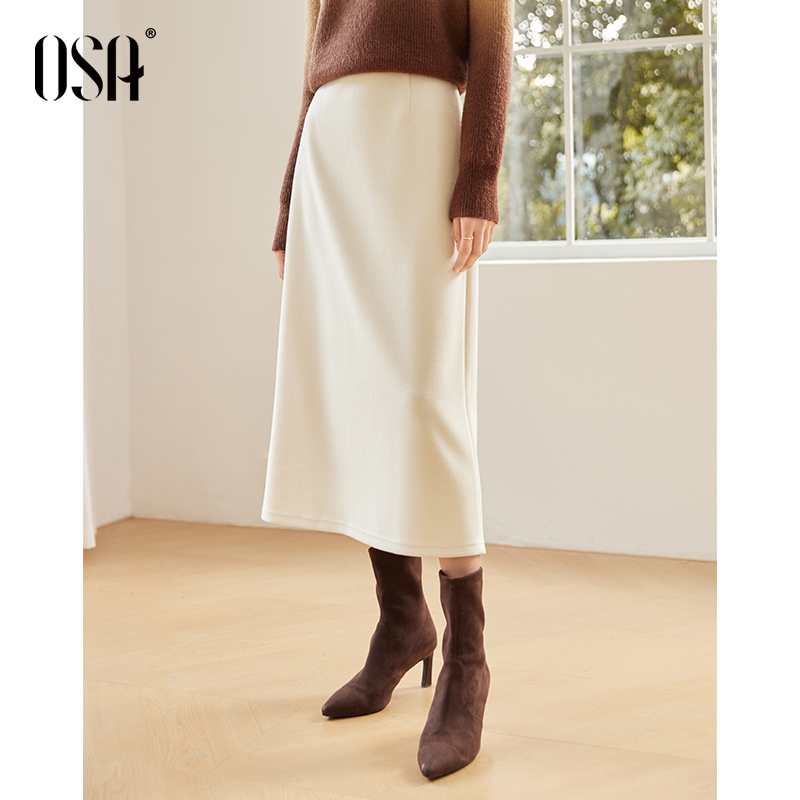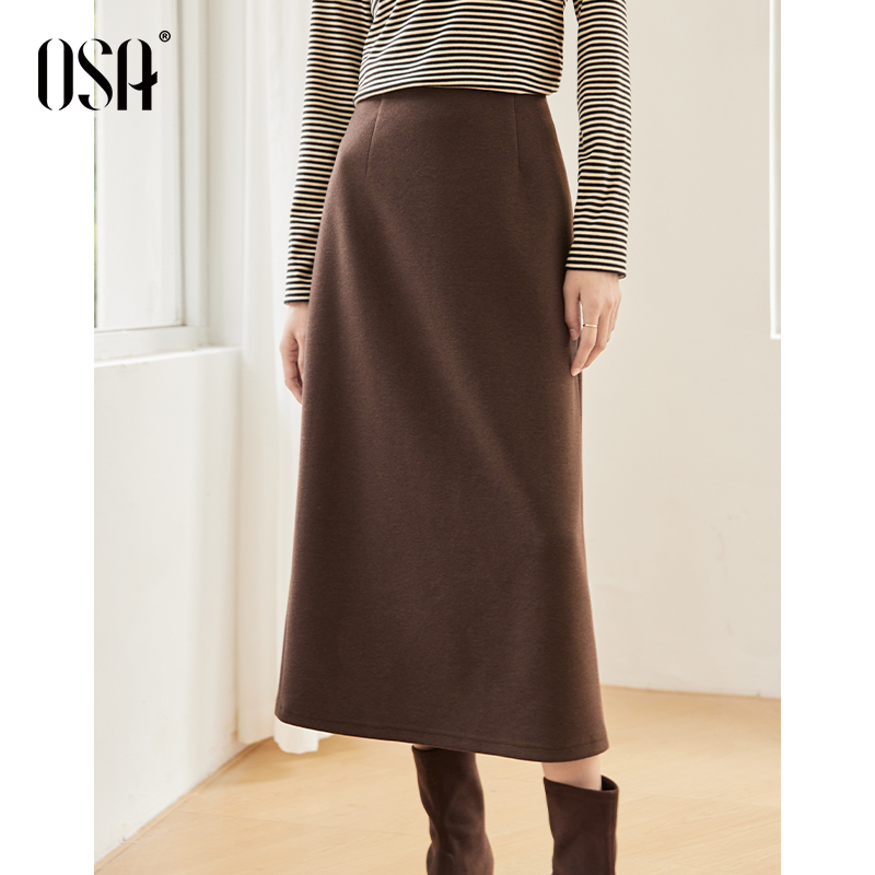 OSA欧莎黑色直筒显瘦半身裙女2025年秋冬新款高腰弹力开衩A字裙子
