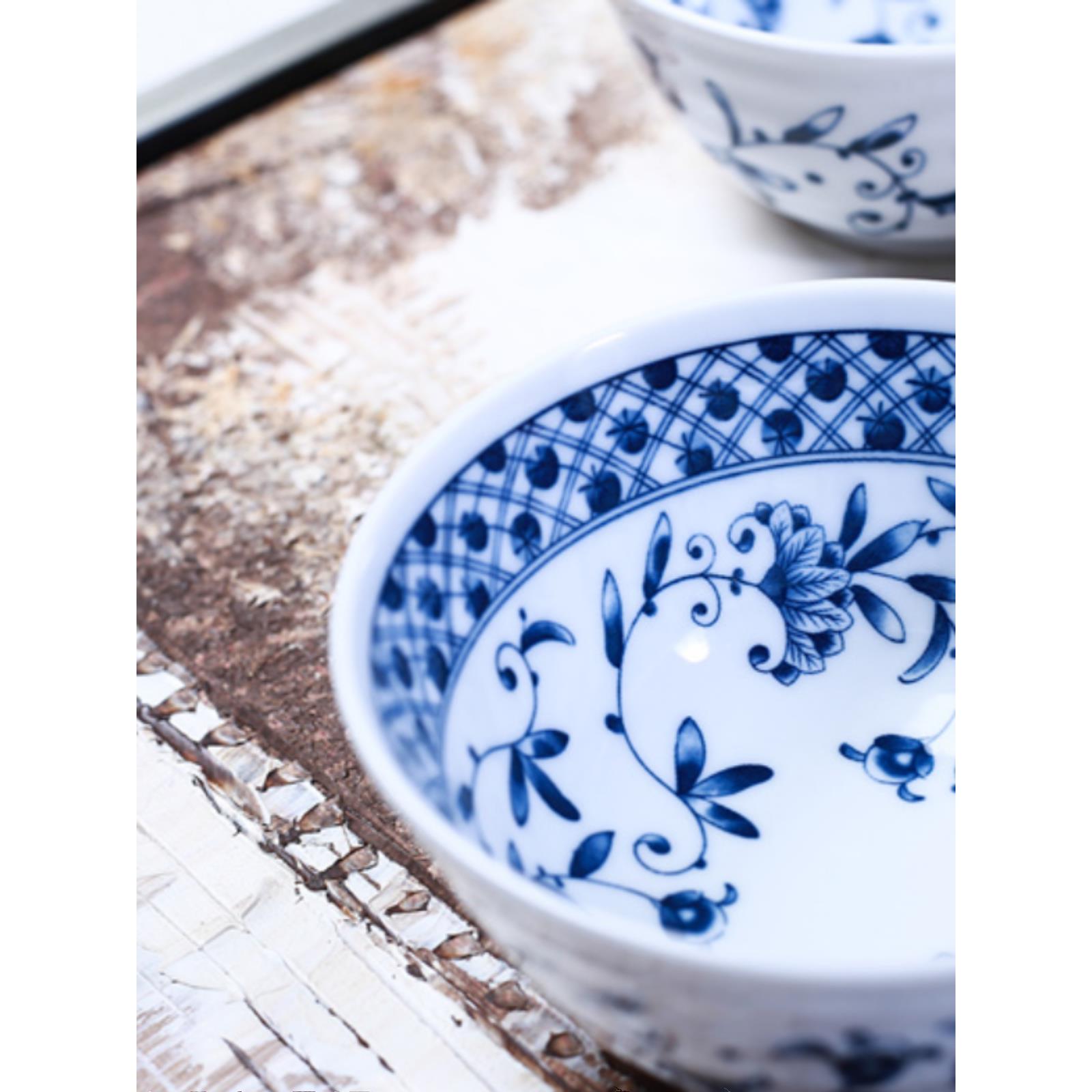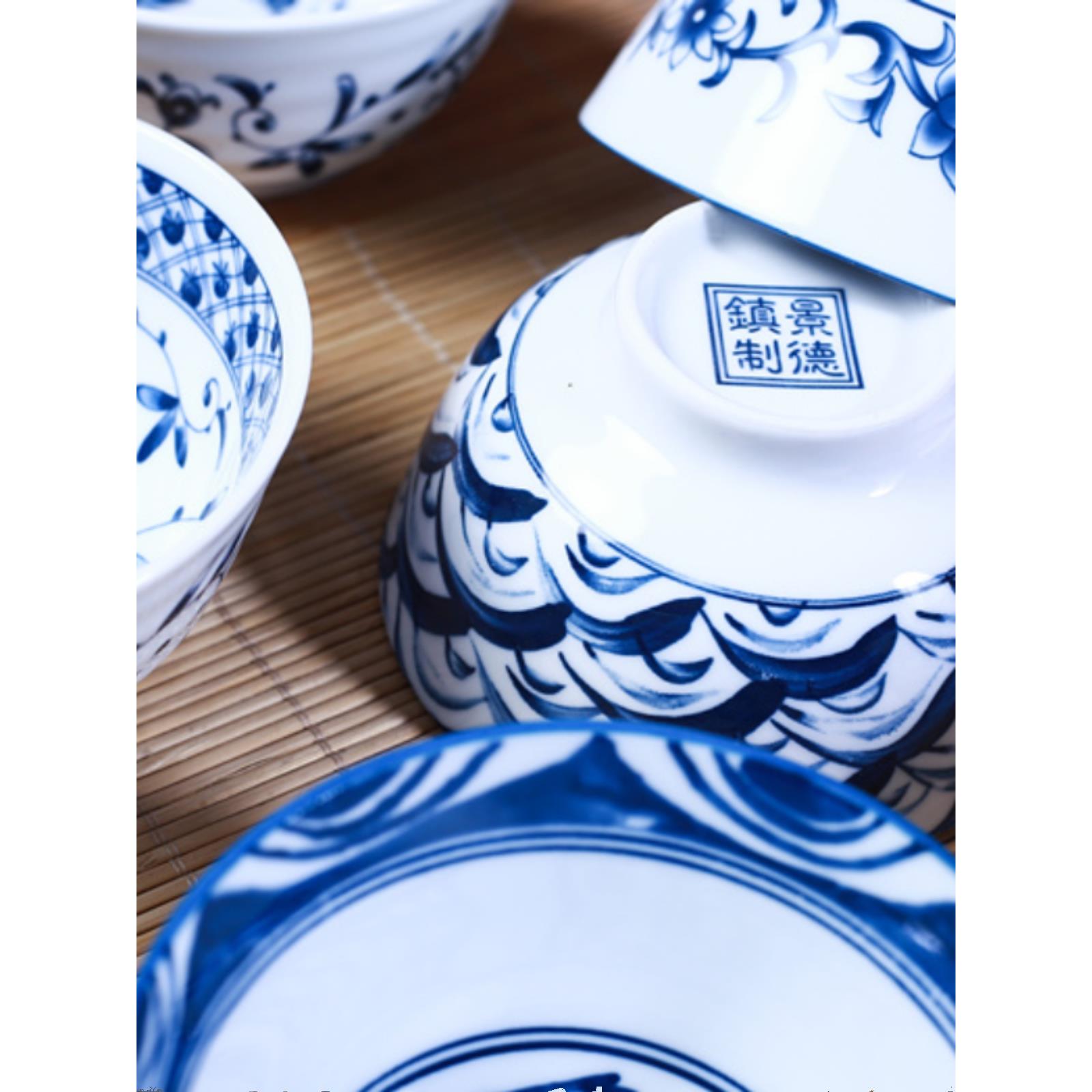 10个家用青花瓷日式高脚防烫米饭碗陶瓷餐具套装创意复古釉下彩碗
