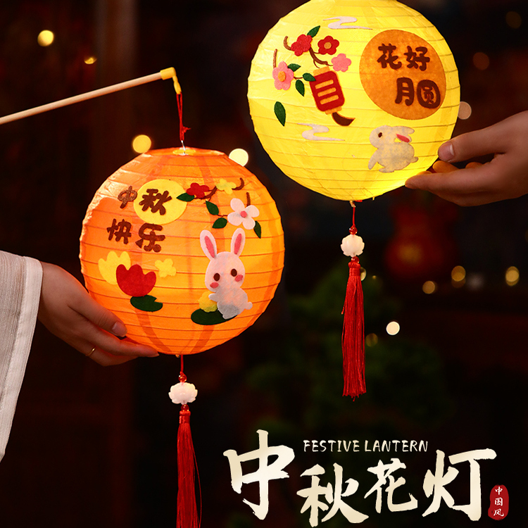 2025新款中秋节diy材料包儿童折叠灯笼古风手提发光兔子手工花灯