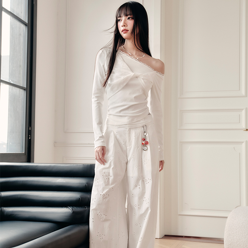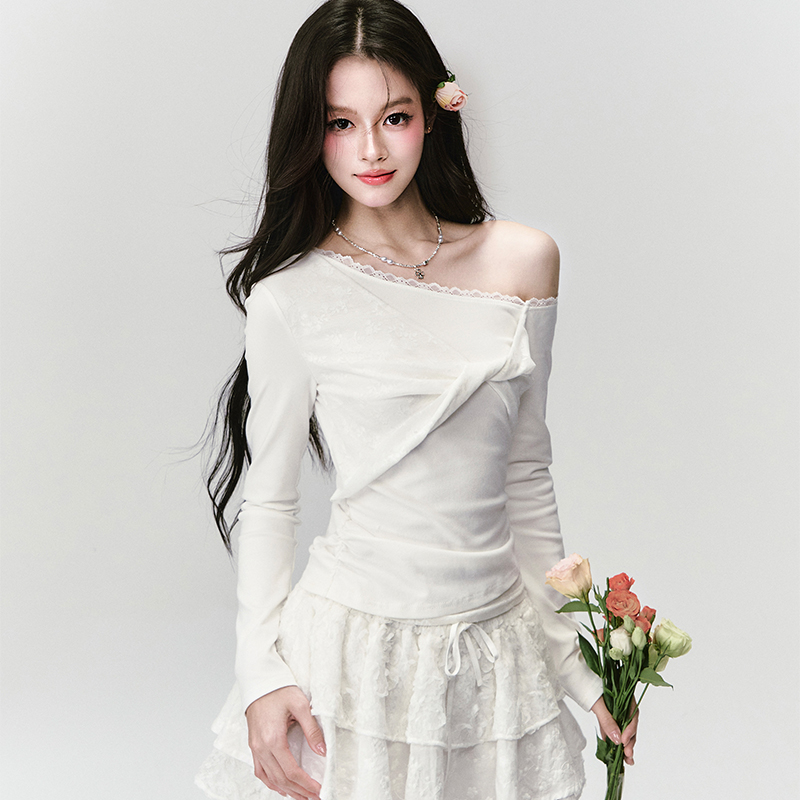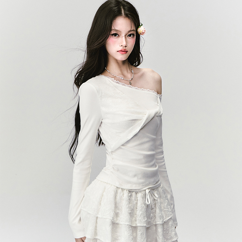 fragileheart易碎商店·白迹风轨 一字肩拼接蕾丝扭结长袖打底衫