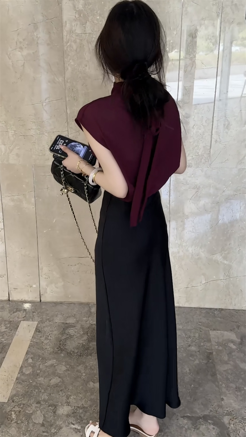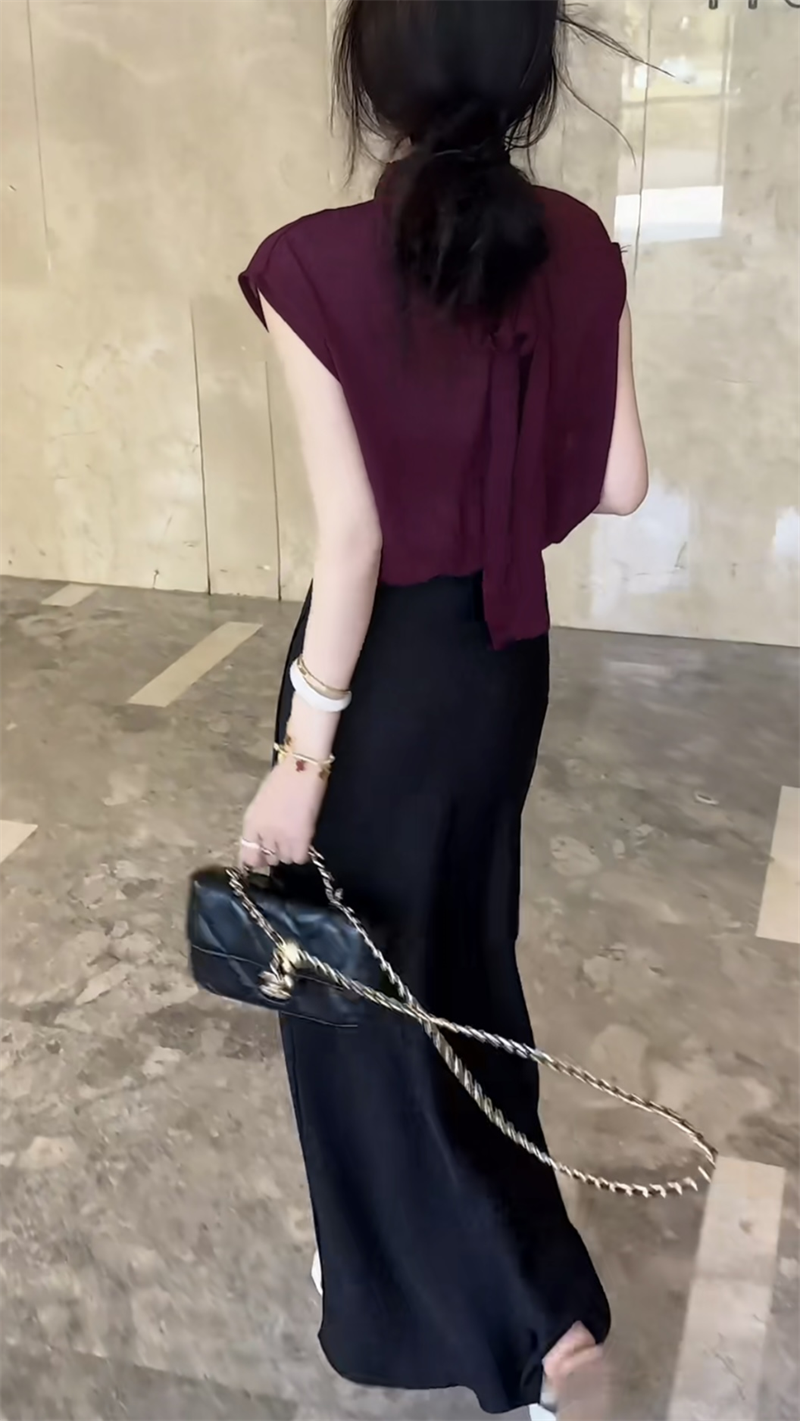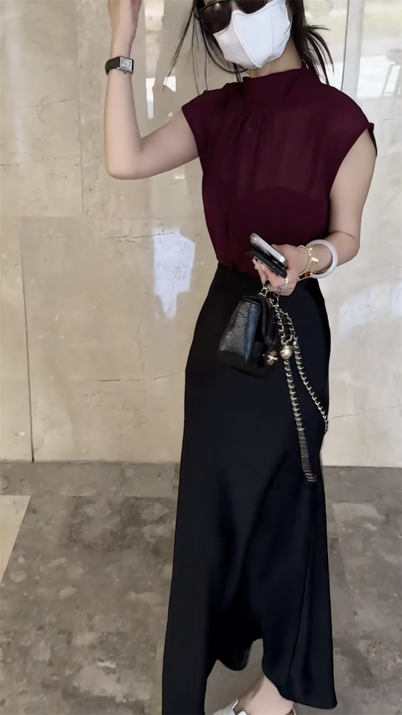 抖音网红爆款潮流时尚设计感女士修身套装纯色坎袖上衣搭配半身裙