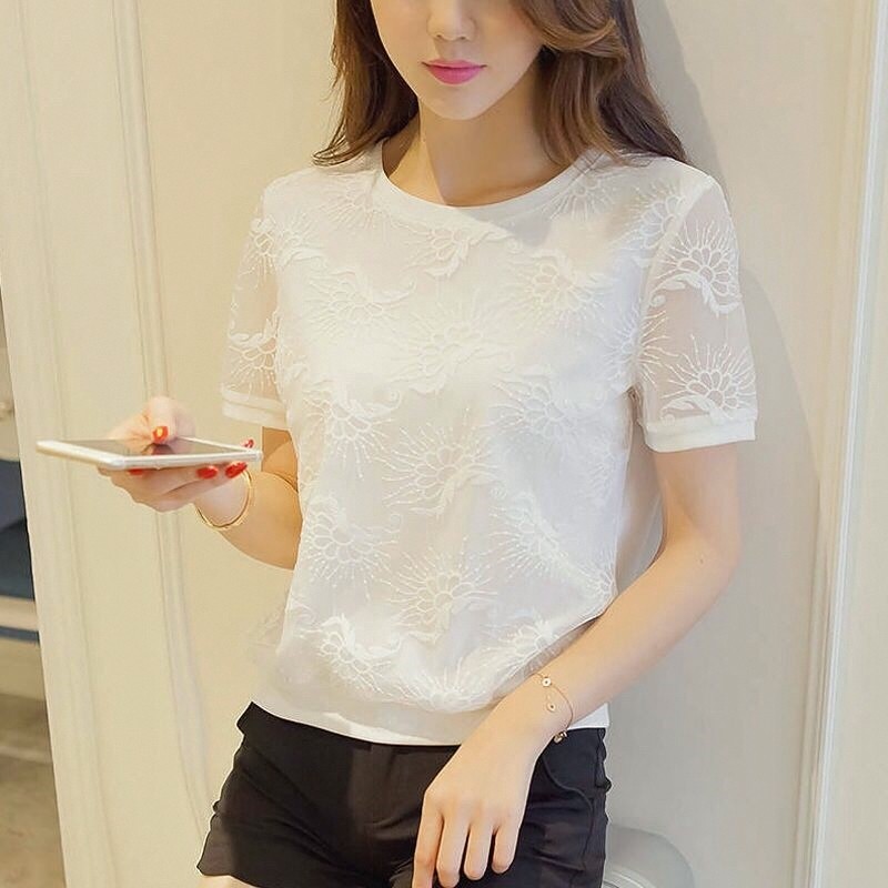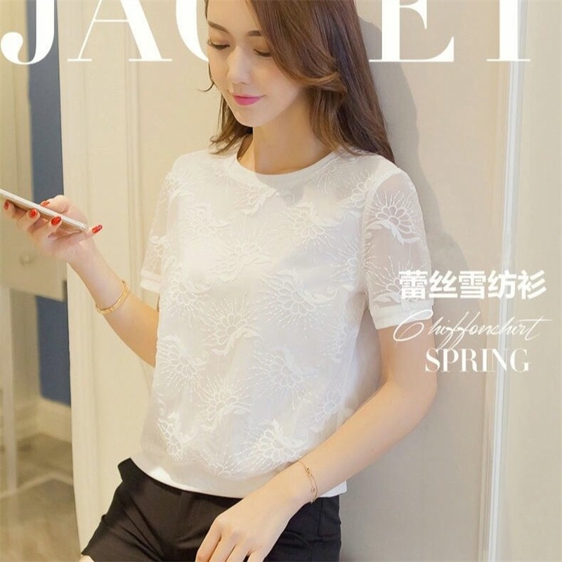 雪纺衫女2025夏装新款白色圆领t恤打底衫夏季蕾丝小衫短袖上衣棉