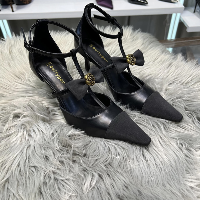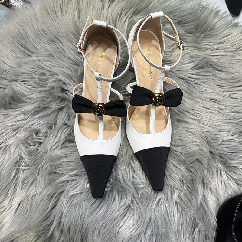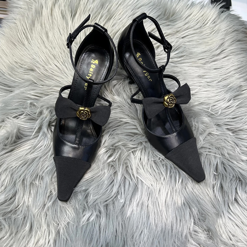 小香风蝴蝶结山茶花中空高跟鞋性感一字带包头凉鞋细跟小方头单鞋