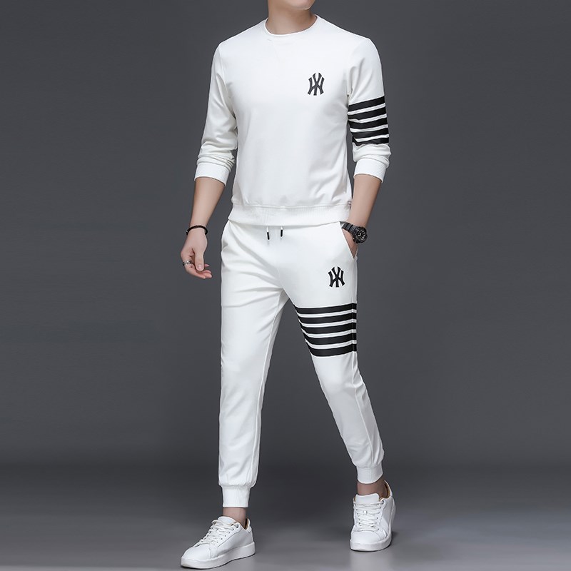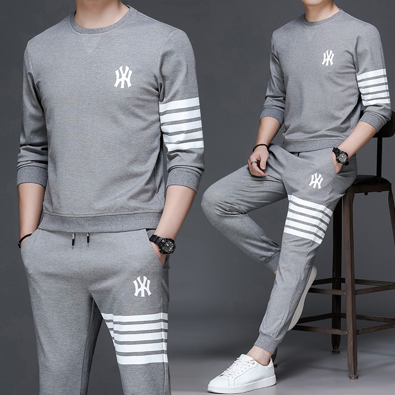 潮牌条纹男士休闲套装春秋季时尚卫衣长裤两件装户外透气运动衣服