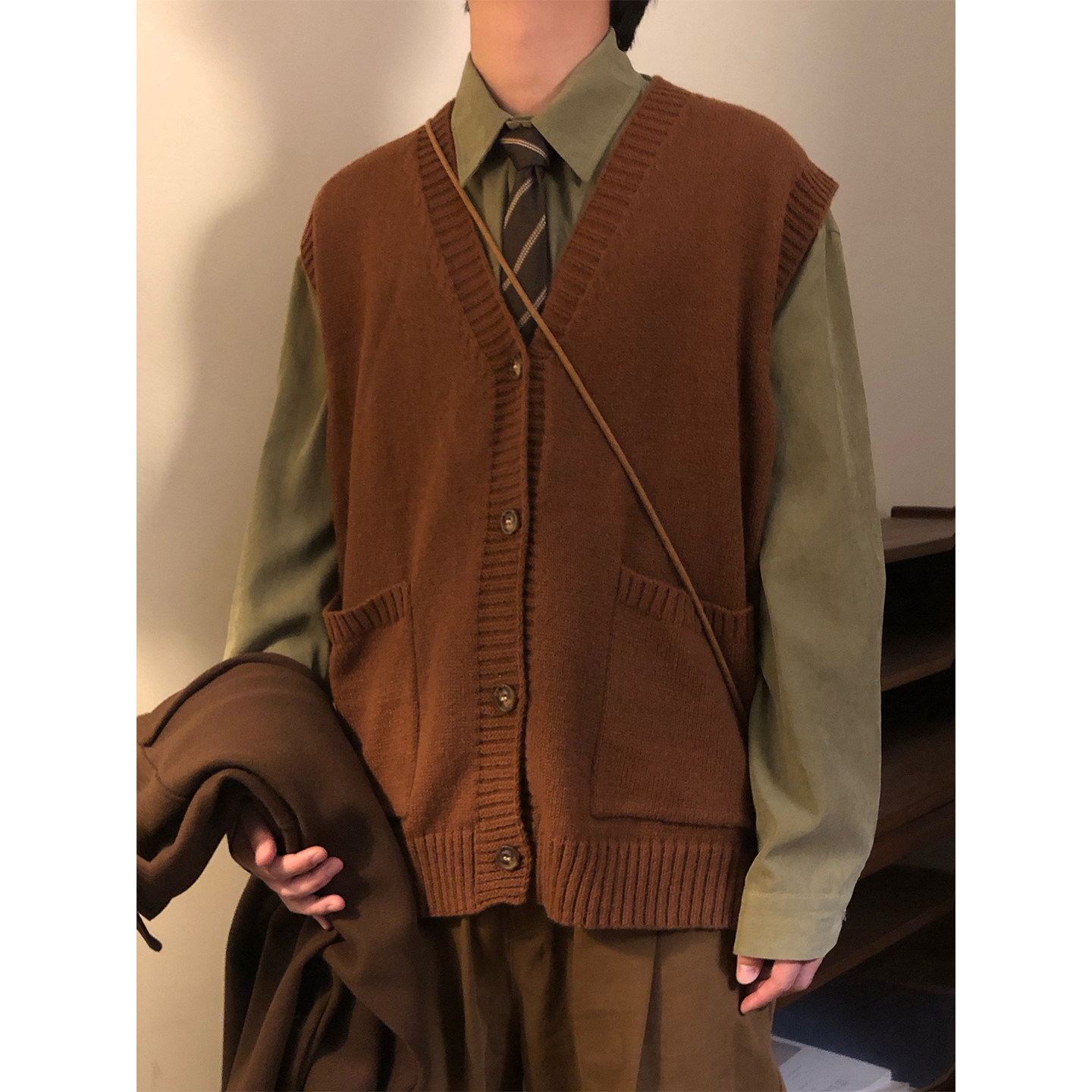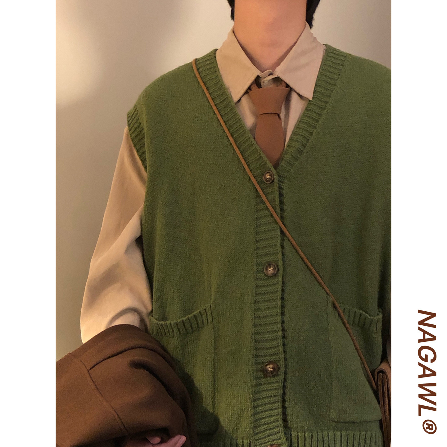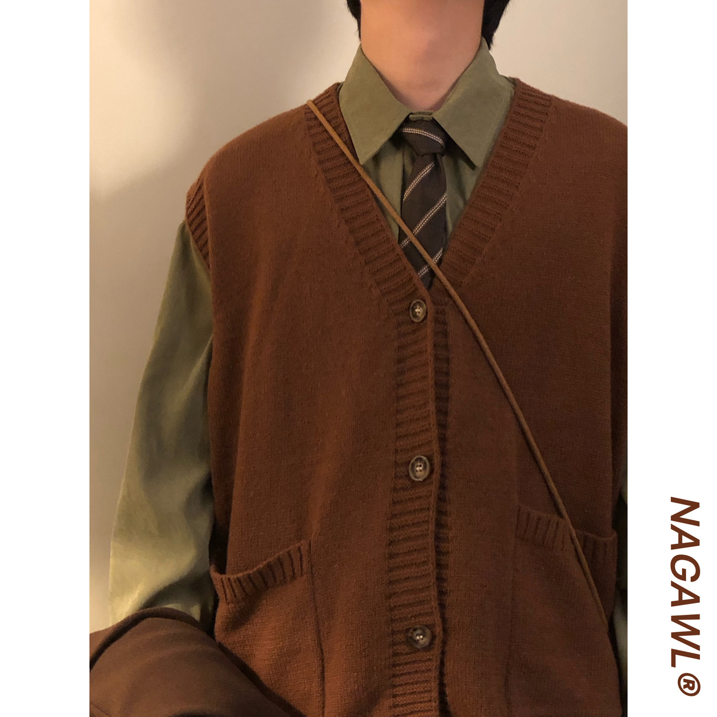 NAGAWL秋冬美式复古学院风V领叠穿马甲针织背心开衫无袖毛衣男女