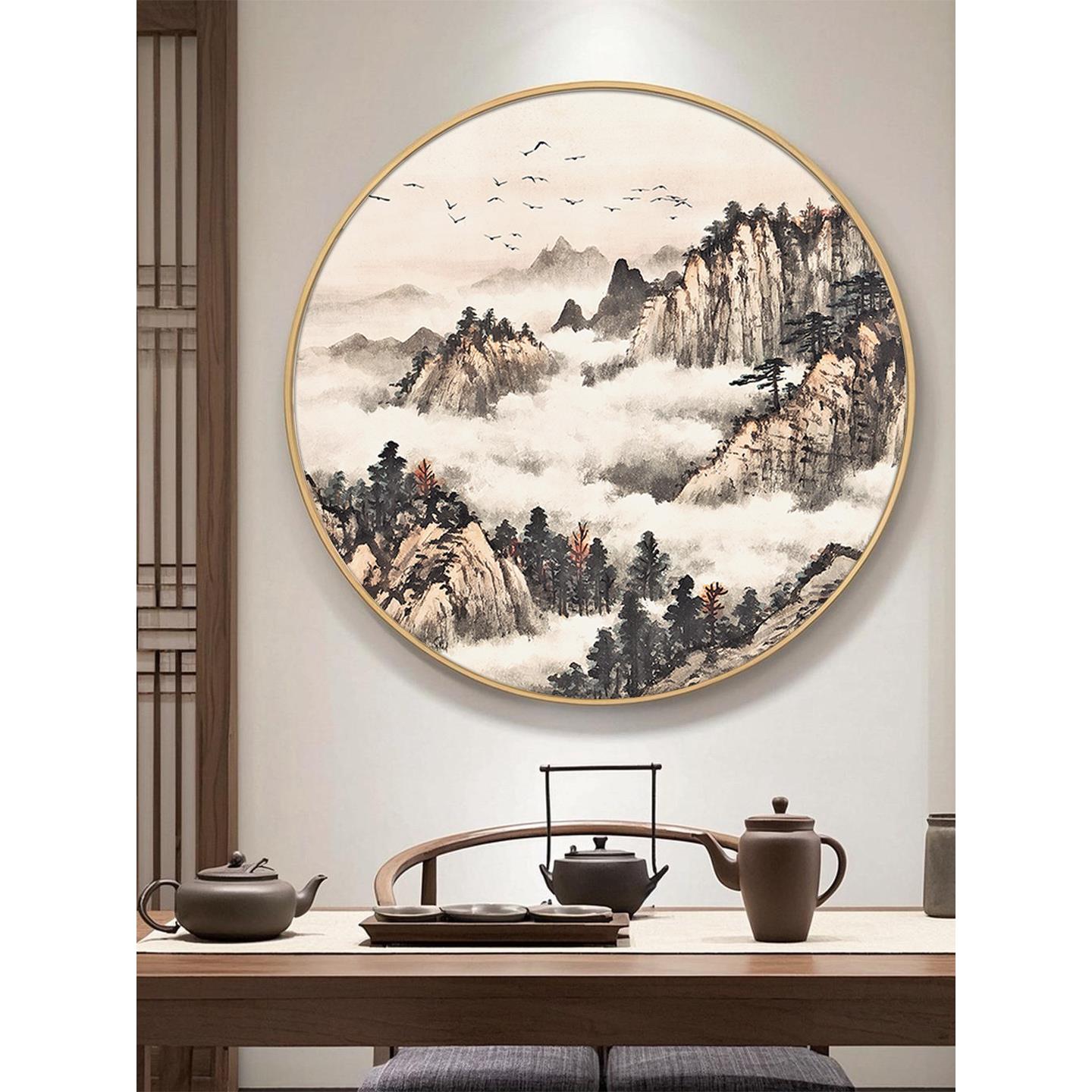 圆形装饰画办公室字画挂画新中式聚财山水风景画客厅玄关墙面壁画