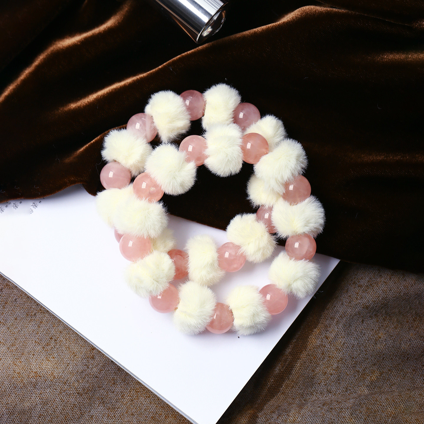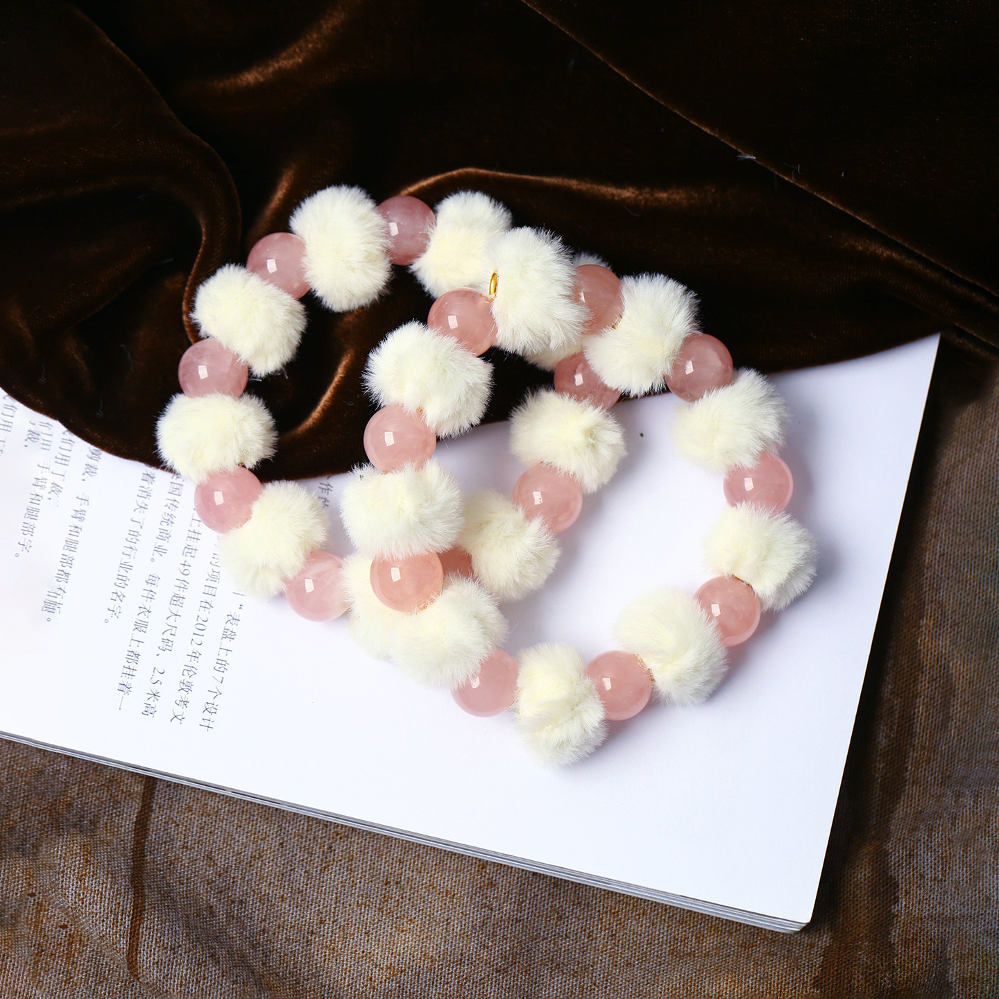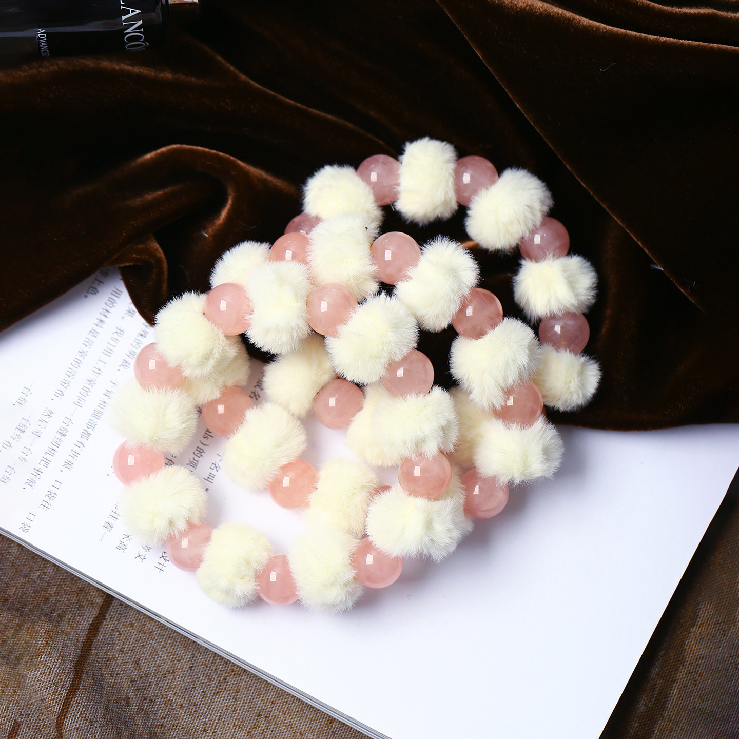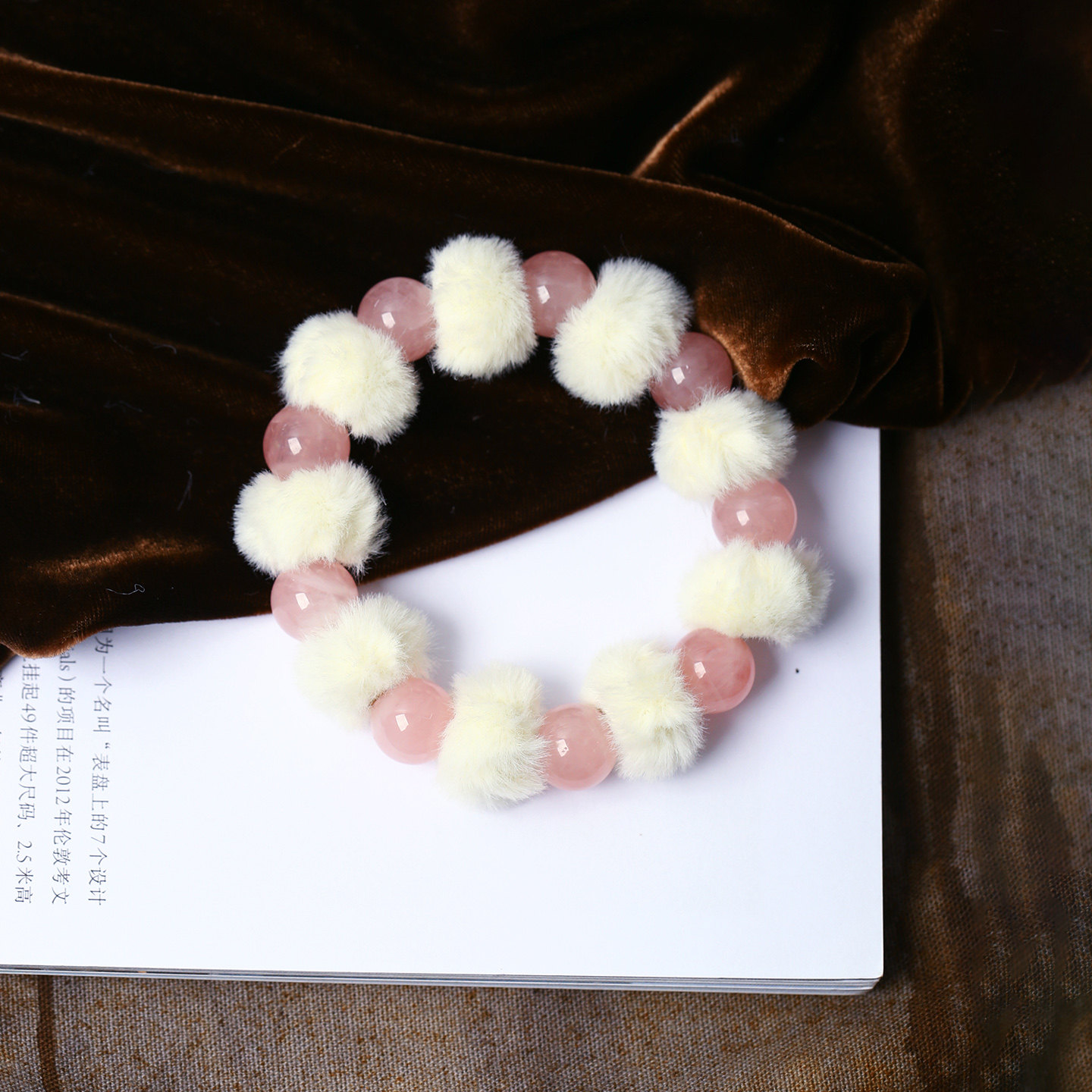 天然粉水晶红圆珠搭配毛绒团原创款手链 女款流行手串饰品礼物