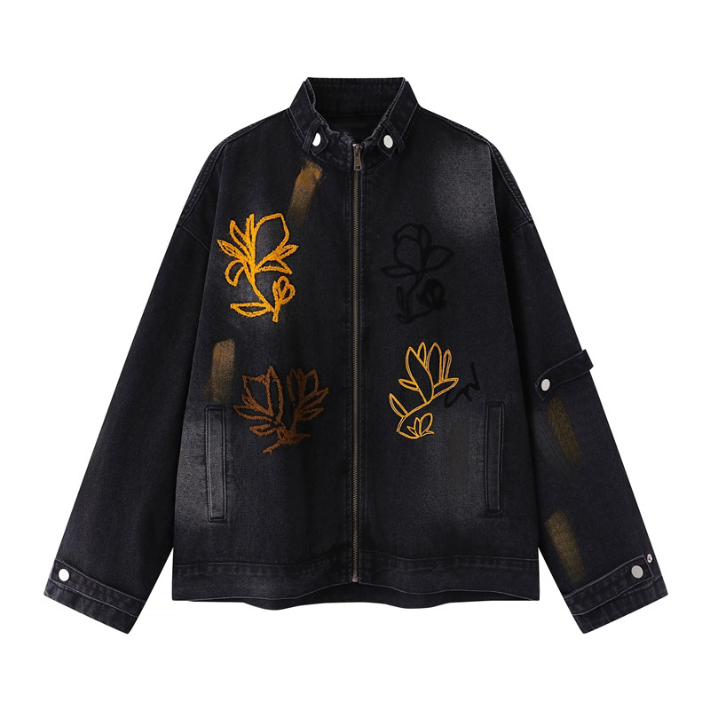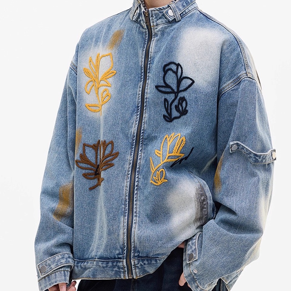 国潮花卉痞帅牛仔外套男秋季美式街头做旧翻领夹克设计感情侣上衣