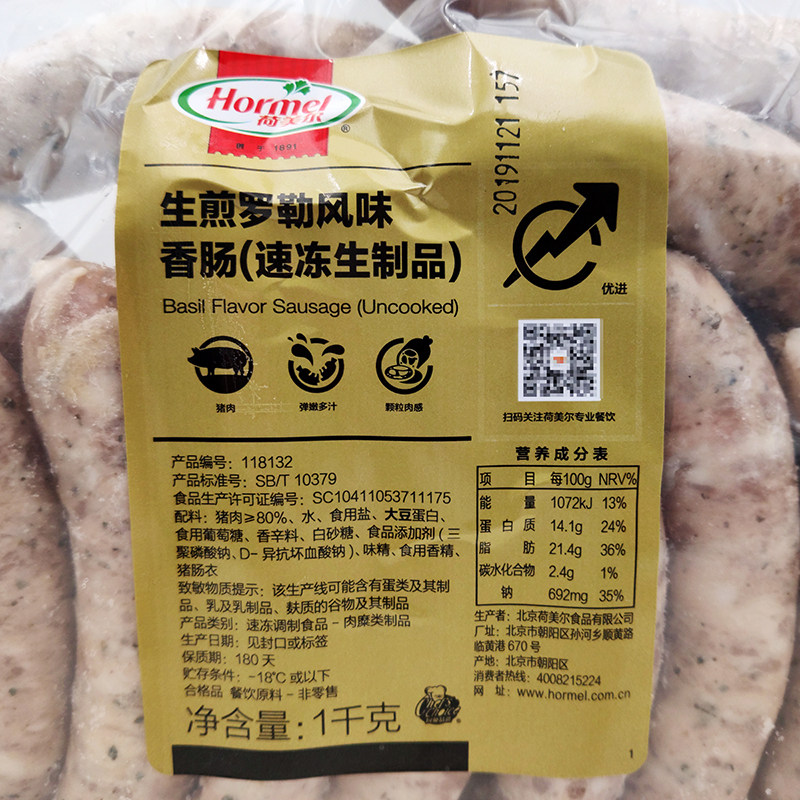 荷美尔生煎罗勒风味香肠1kg 约17根生制西式比萨肠油煎肠猪肉肠