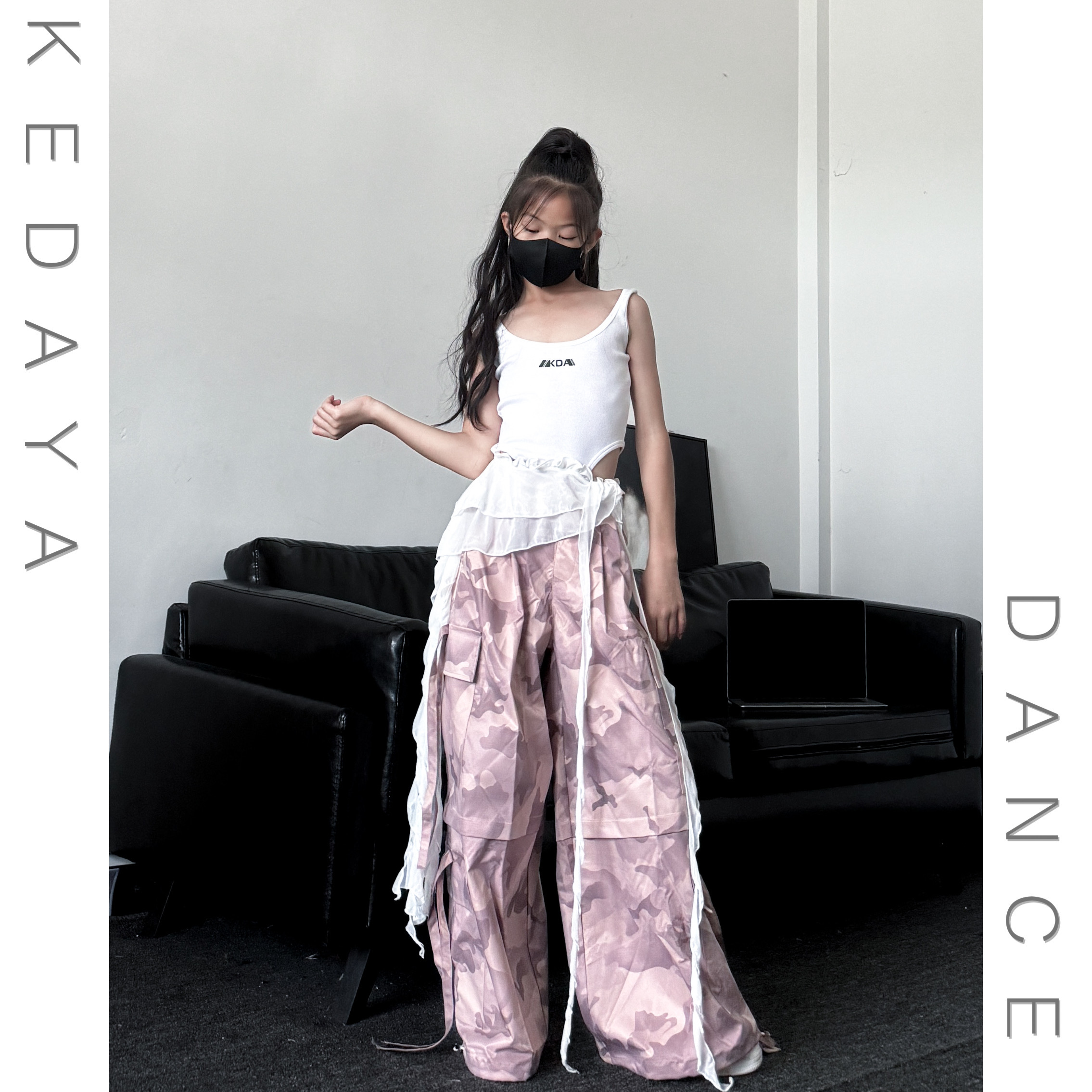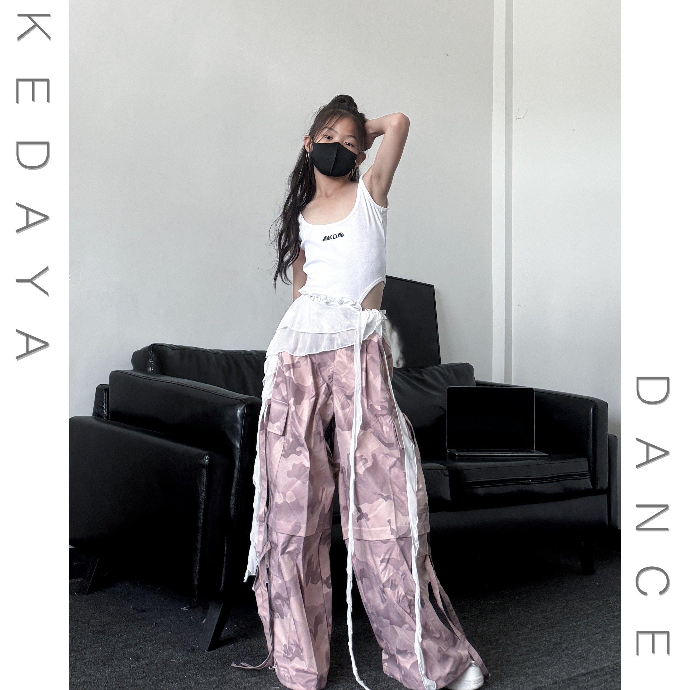 2025春夏新款女童无袖连体背心冰丝迷彩工装裤爵士舞演出服套装