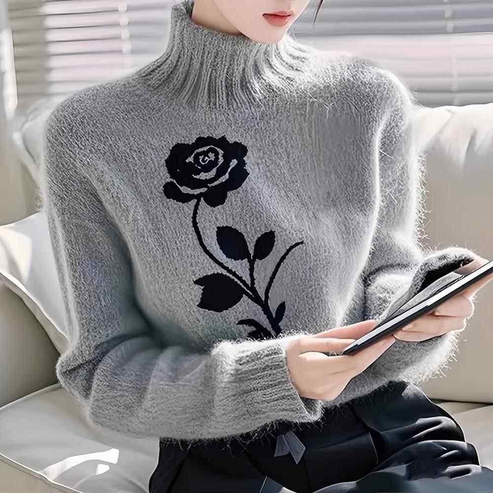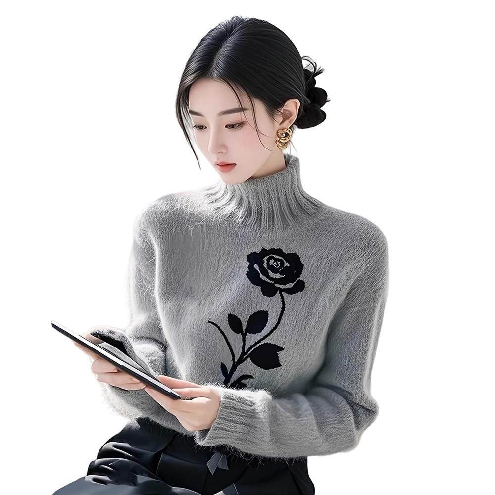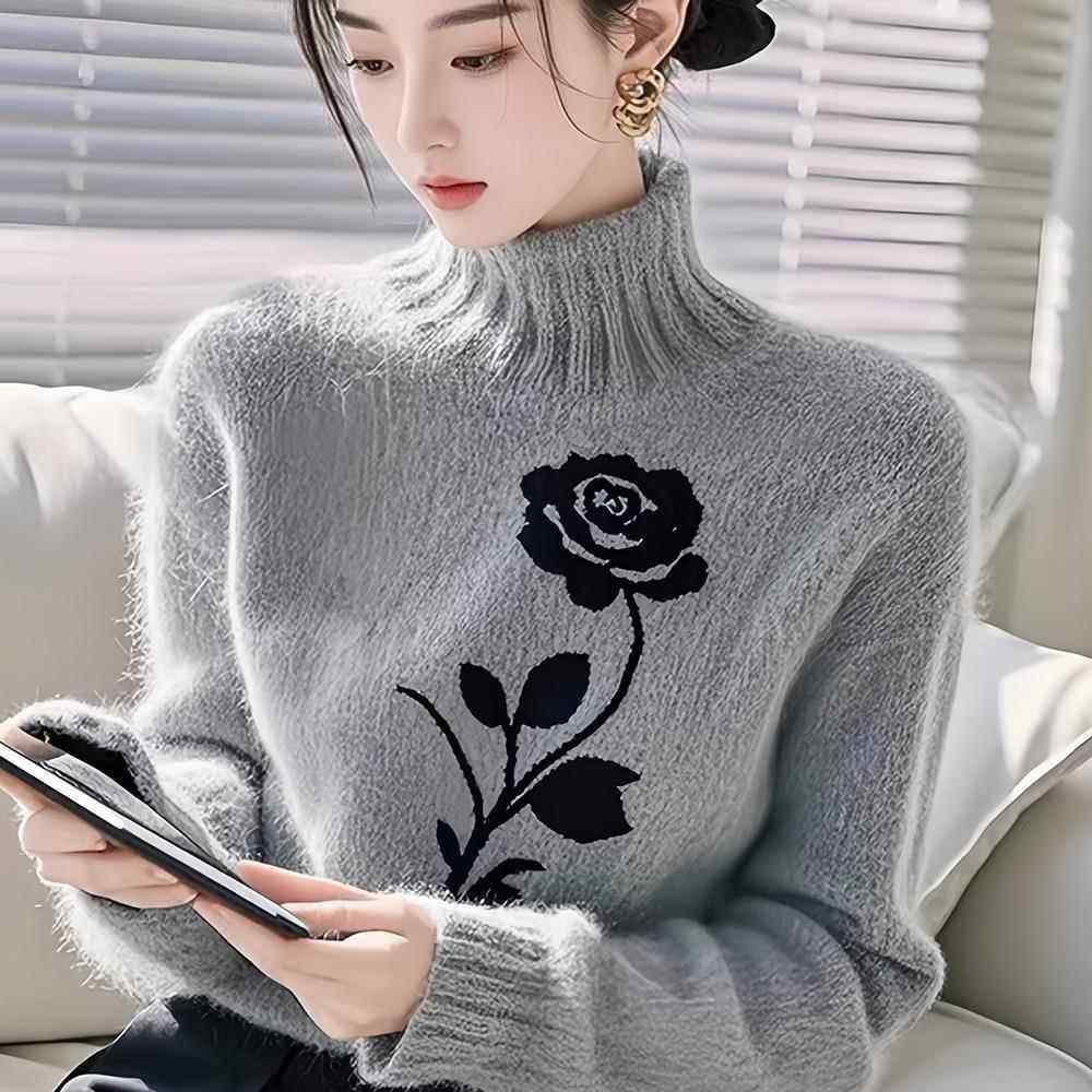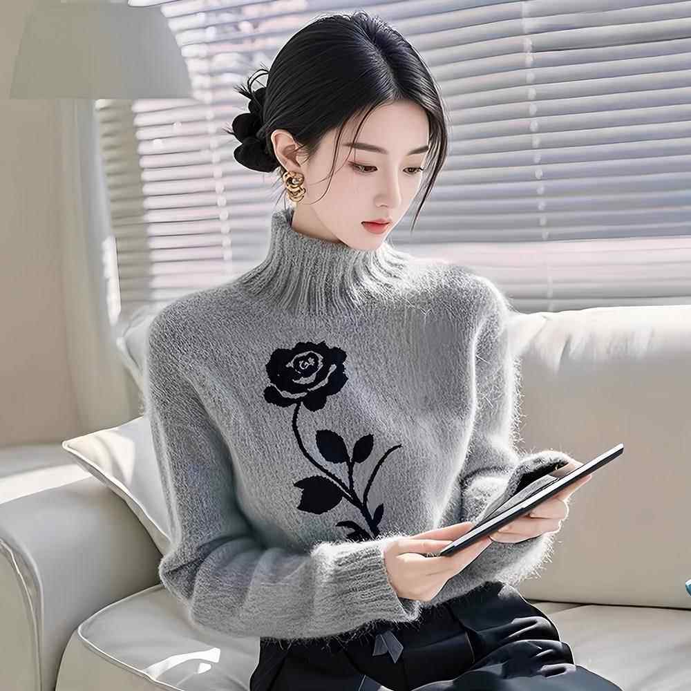 灰色毛衣搭配高领玫瑰印花内搭针织衫女2025新款秋季穿搭独1222r