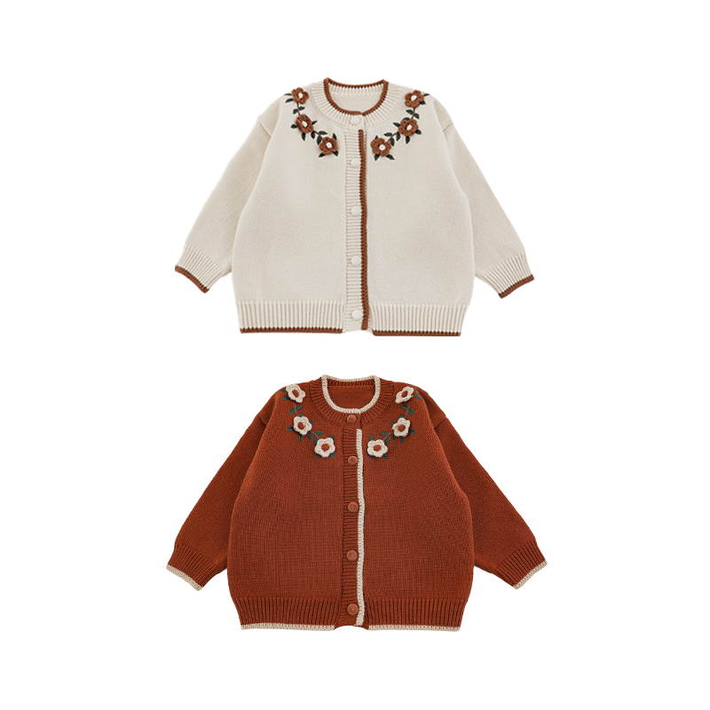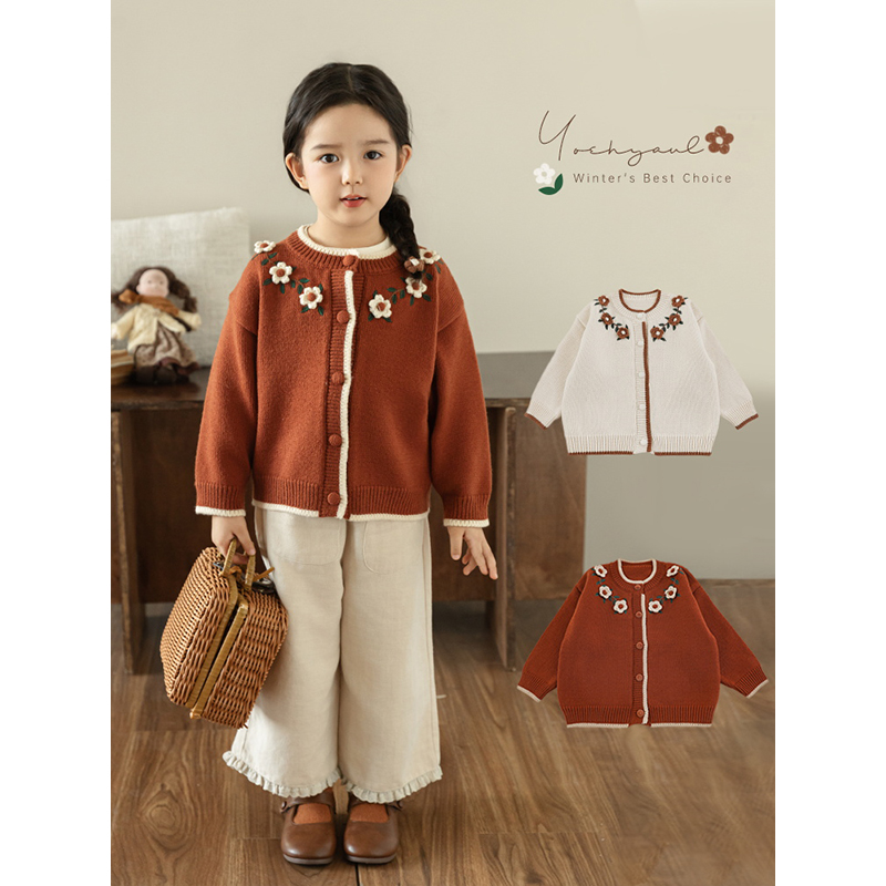 幼悠女童绣花毛衣开衫冬季萌趣可爱罗纹织边撞色夹条防风保暖上衣