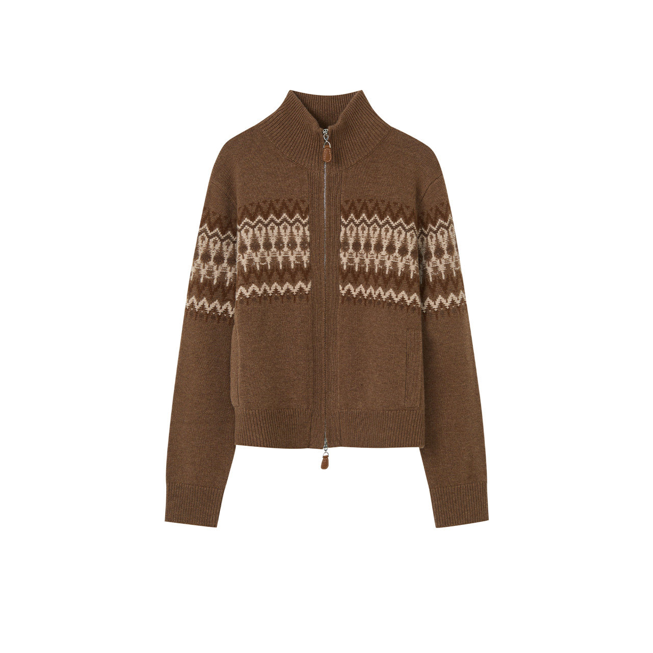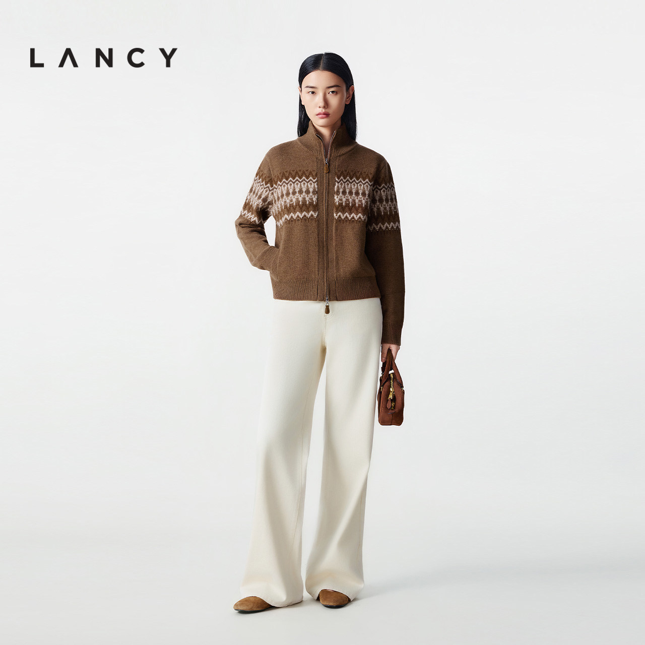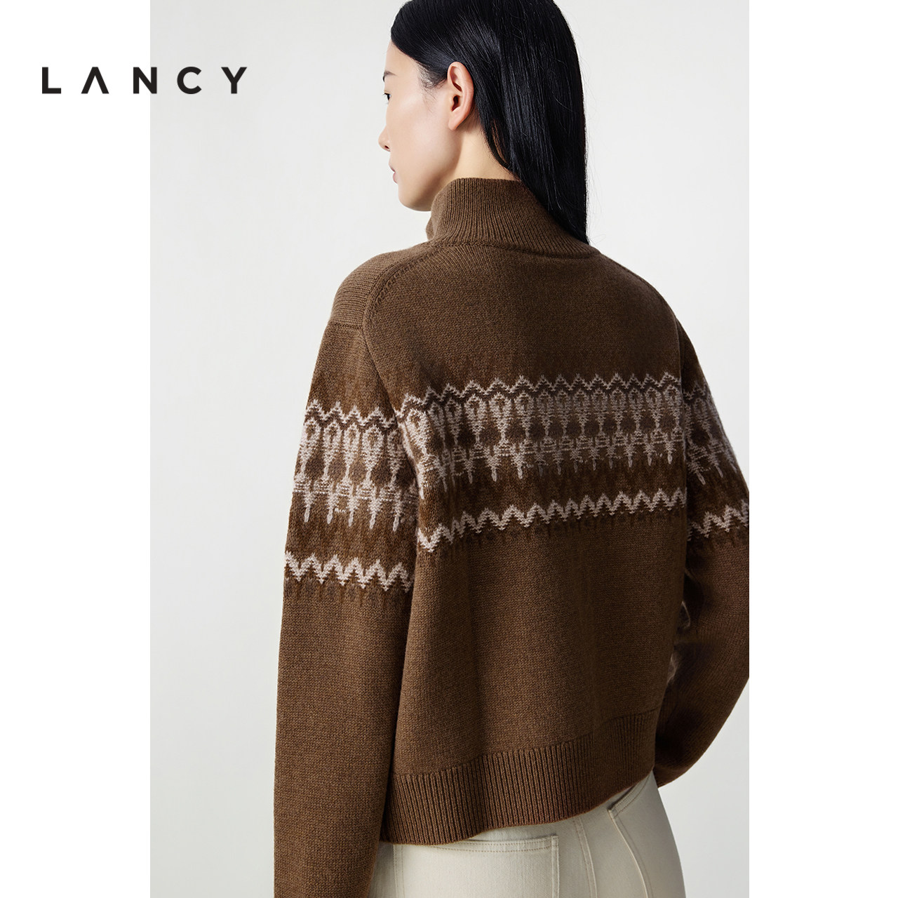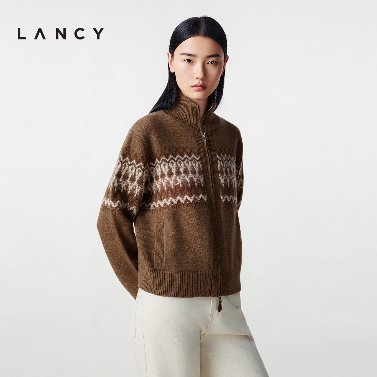 【纯羊毛】LANCY/朗姿2025冬新款费尔岛高领双拉链提花针织开衫女