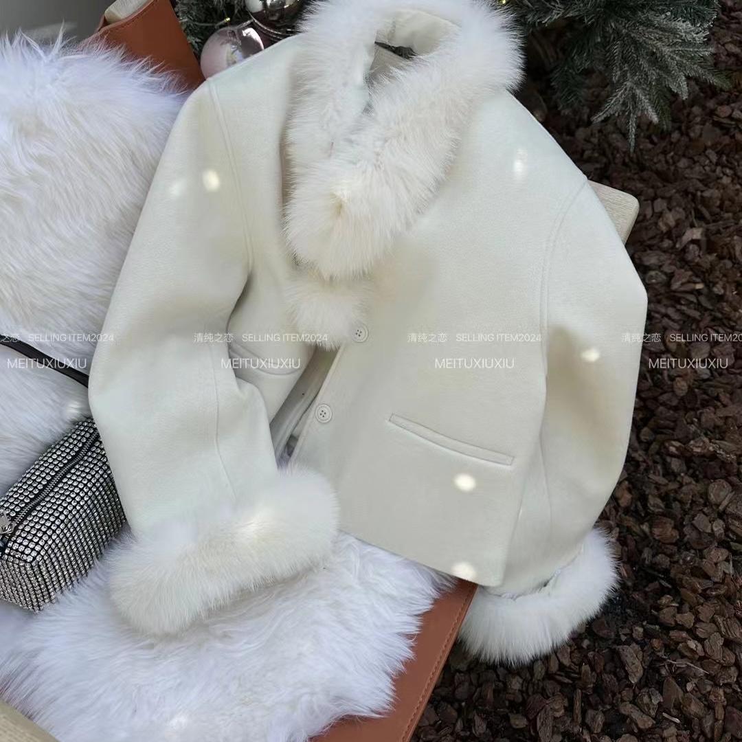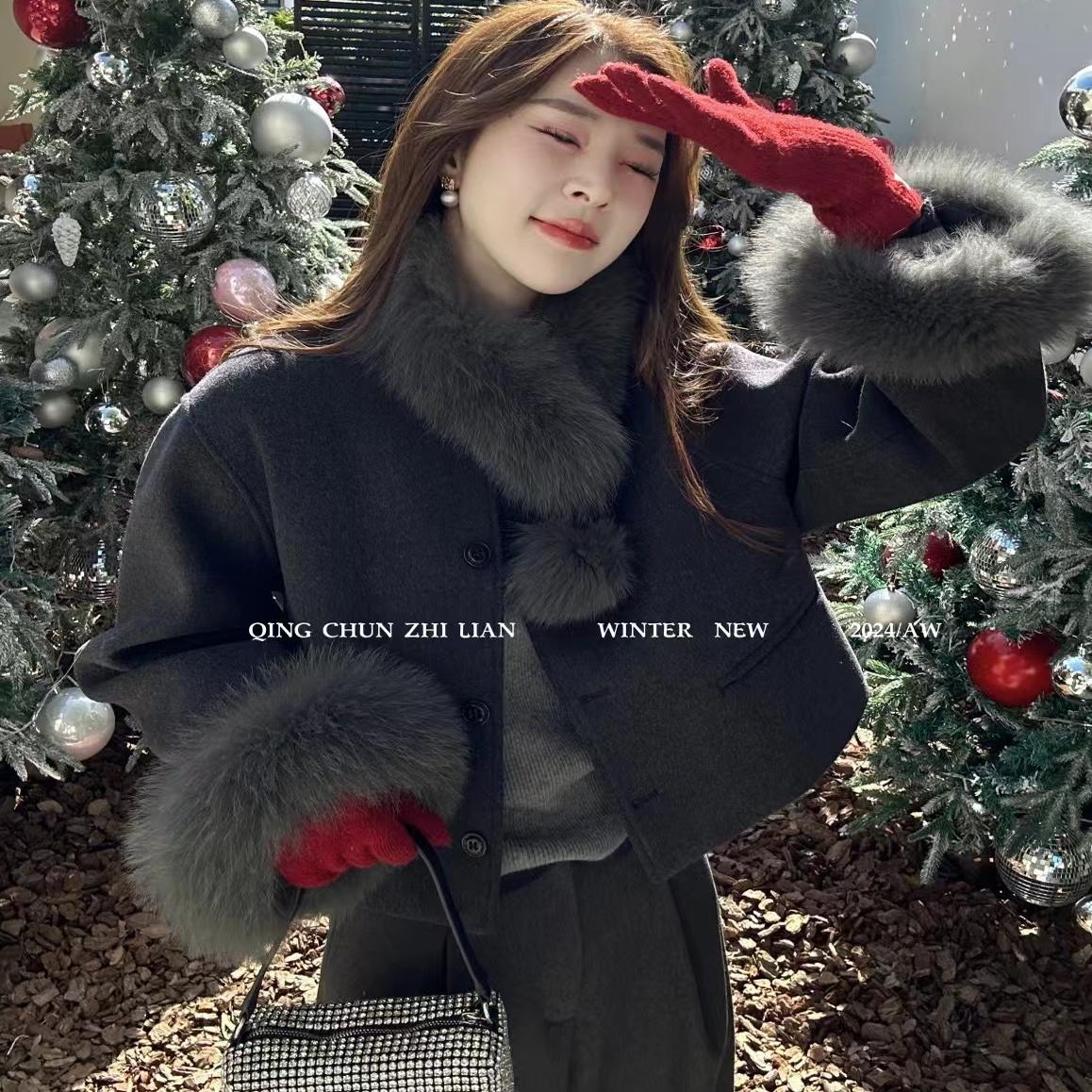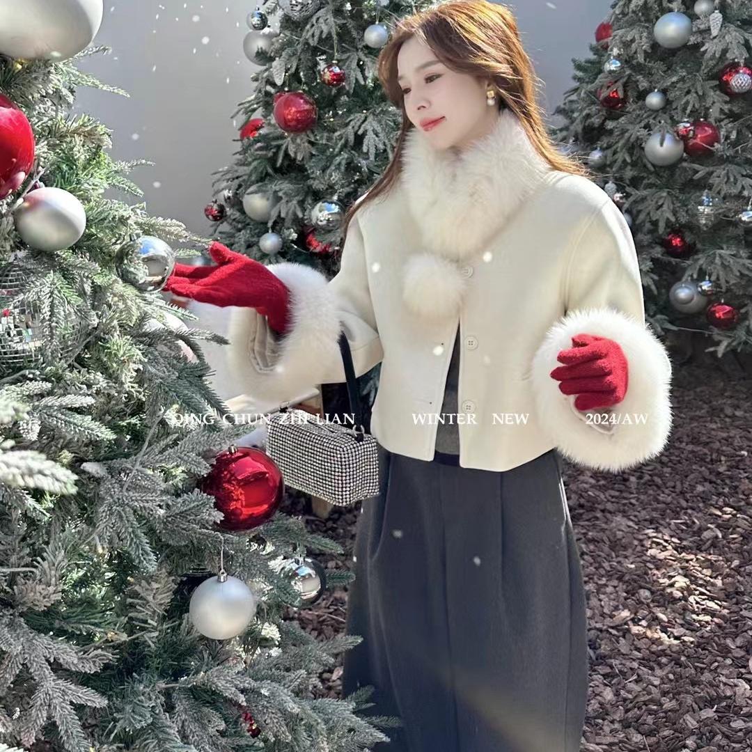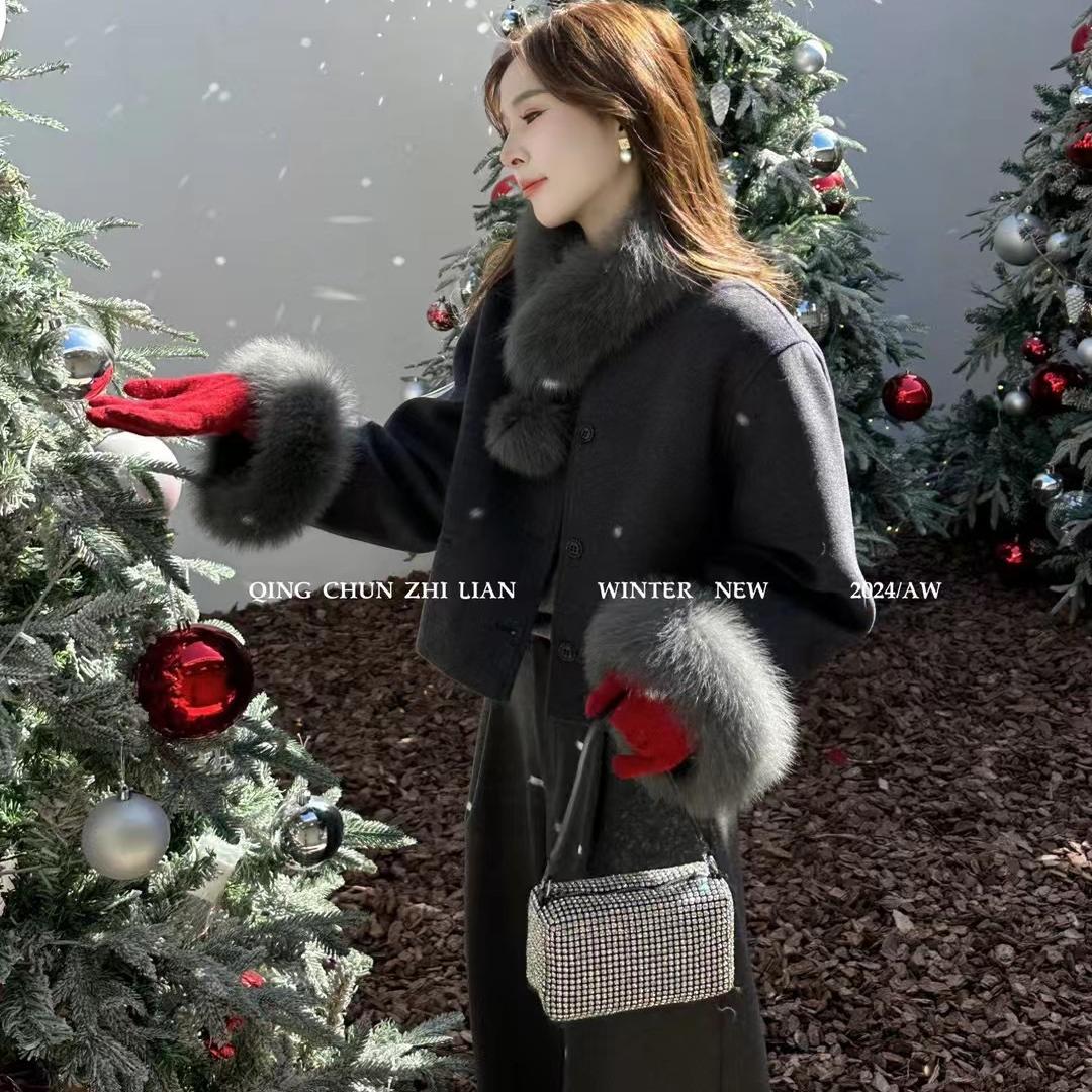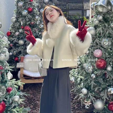 特价91850狐狸毛领围脖短款毛呢短外套小个子羽绒服小香风女装冬
