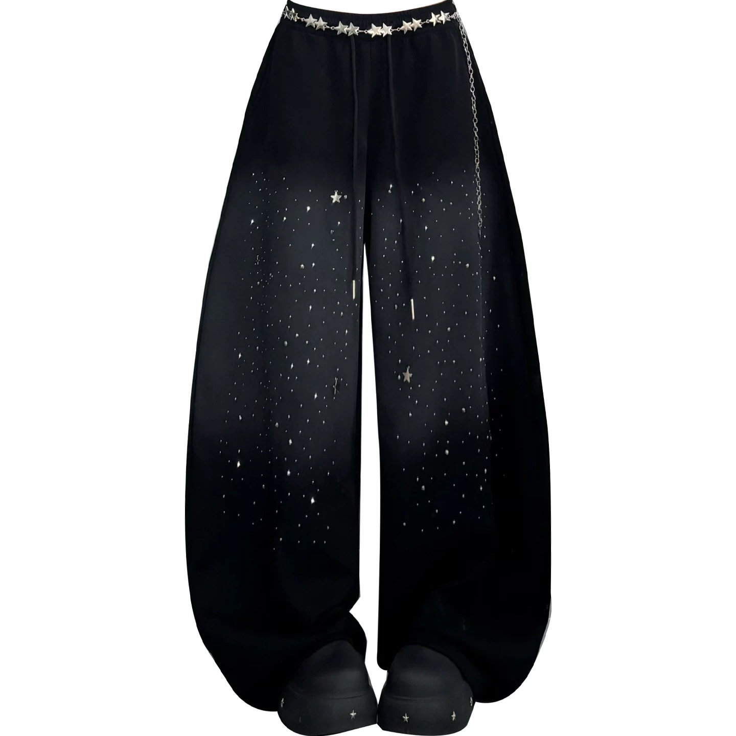 大码烫钻星空渐变黑色弯刀裤女装春秋宽松抽绳卫裤休闲爵士舞裤子