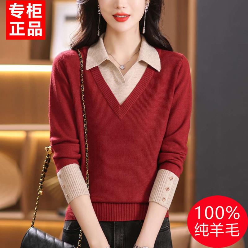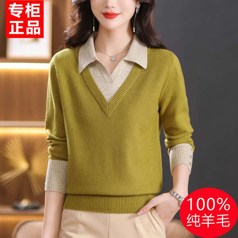 针织衫女2025新款春秋方领上衣假两件羊毛衫100纯羊绒套头毛衣
