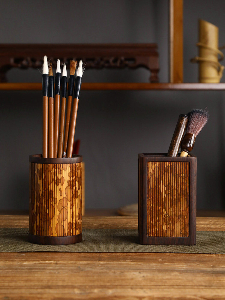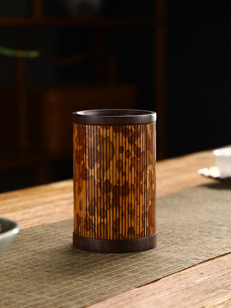 湘妃竹笔筒黑檀茶筒竹制文房书房茶室收纳筒中式复古茶道六君子