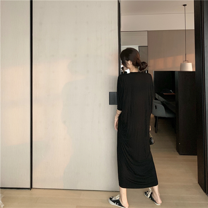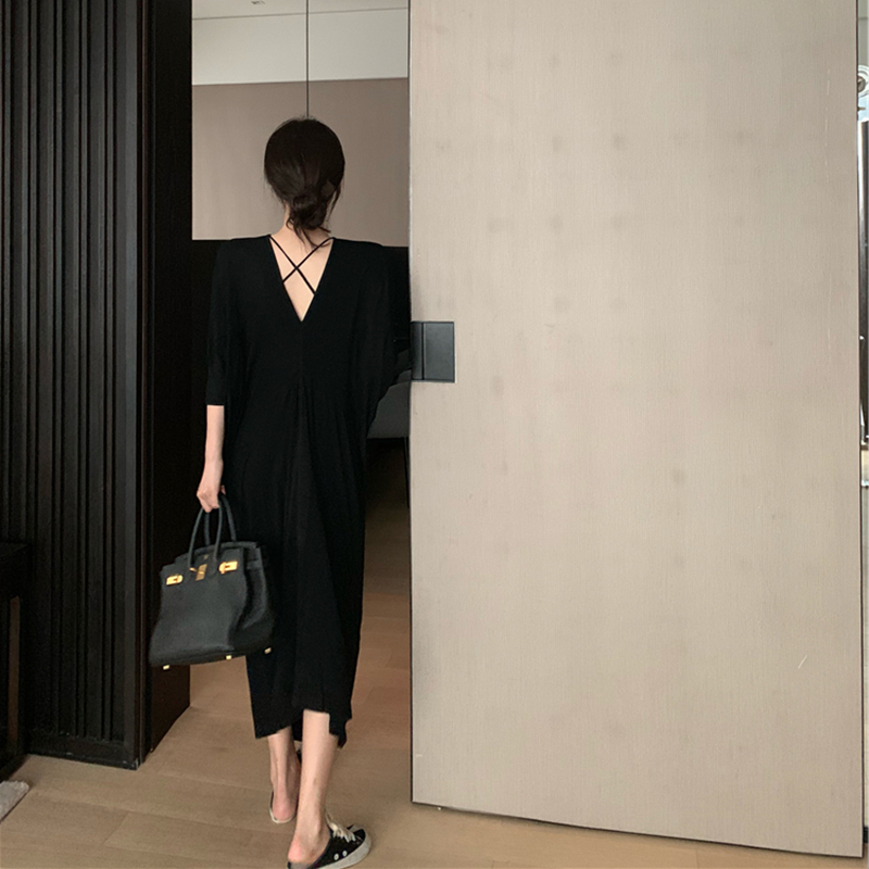 莫代尔连衣裙女夏2025新款蝙蝠袖性感V领气质慵懒风黑色长款裙子